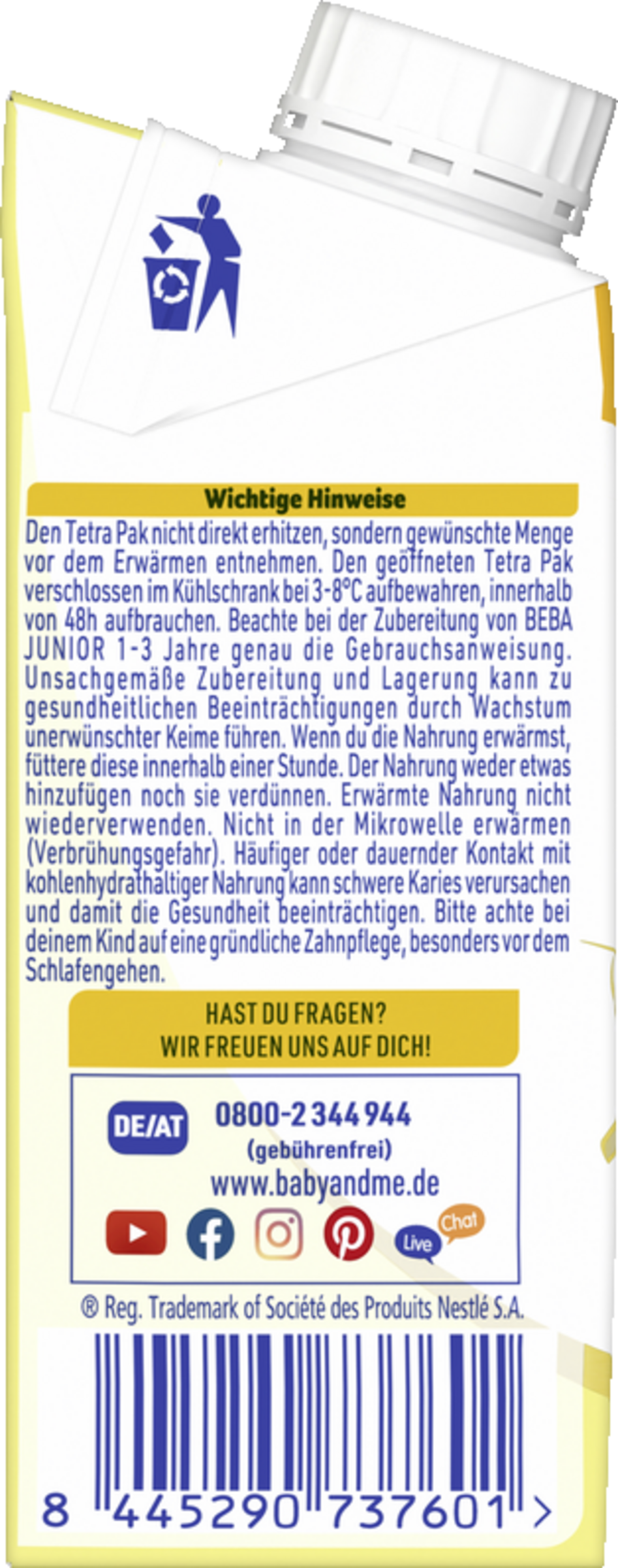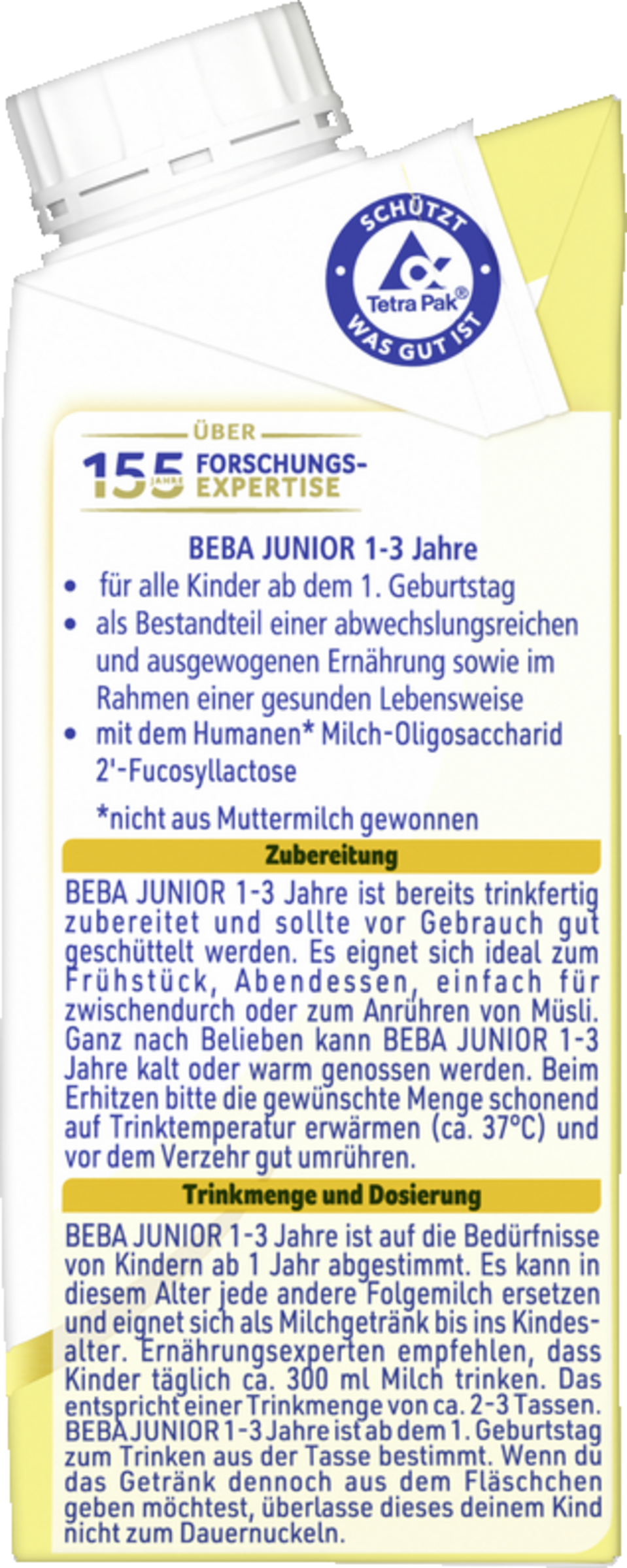 Den Tetra Pak nicht direkt erhitzen, sondern gewünschte Menge vor dem Erwärmen entnehmen. Beachte bei der Zubereitung von BEBA JUNIOR 1-3 Jahre genau die Gebrauchsanweisung. Unsachgemäße Zubereitung und Lagerung kann zu gesundheitlichen Beeinträchtigungen durch Wachstum unerwünschter Keime führen. Erwärme die Nahrung vor jeder Mahlzeit und füttere diese innerhalb einer Stunde. Der Nahrung nichts hinzufügen noch sie verdünnen. Erwärmte Nahrung nicht wiederverwenden. Nicht in der Mikrowelle erwärmen (Verbrühungsgefahr).