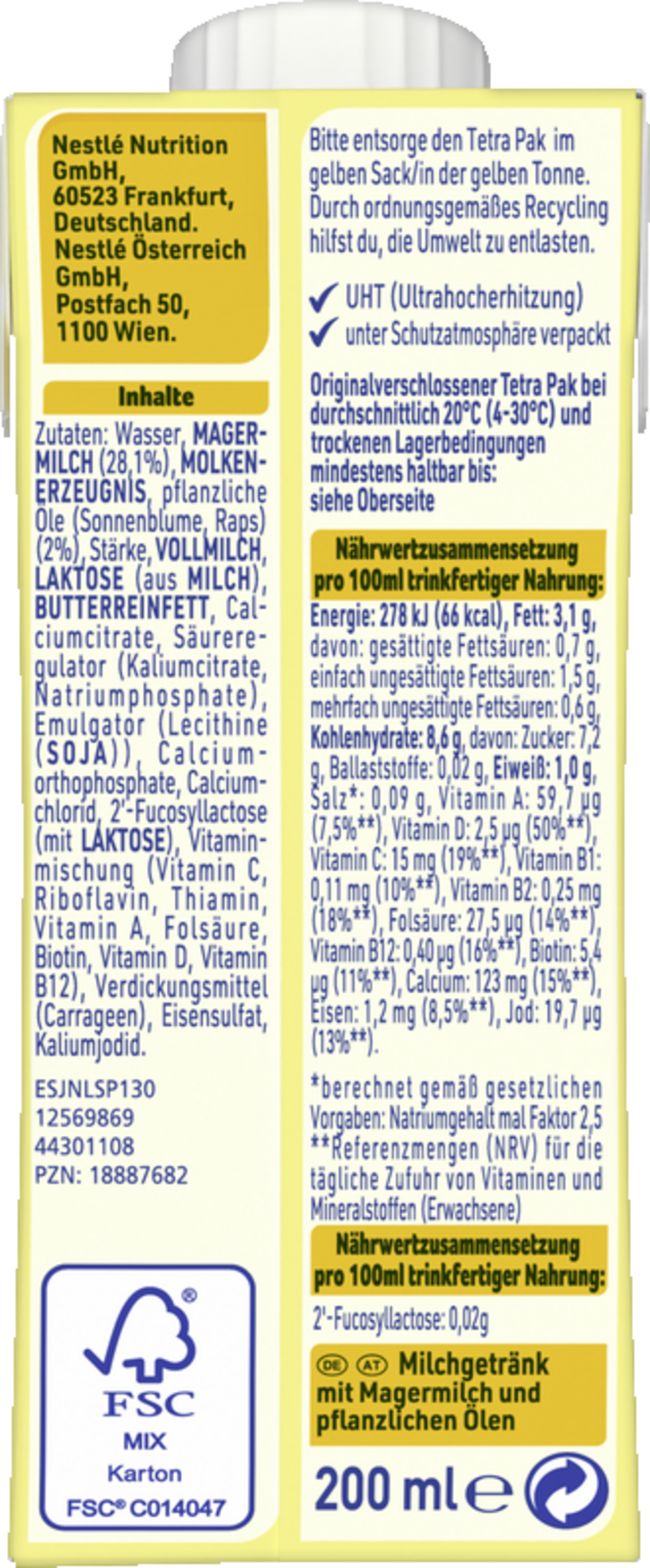 Wasser, MAGERMILCH (28,1 %), MOLKENERZEUGNIS, pflanzliche Öle 2 % (Raps, Sonnenblumen), Stärke, VOLLMILCH, LAKTOSE (aus MILCH), BUTTERREINFETT, Calciumcitrate, Säureregulator (Kaliumcitrate), Emulgator Lecithine (SOJA), Calciumorthophosphate, Natriumorthophosphate, Calciumchlorid, 2´- Fucosyllactose (mit LAKTOSE), Vitaminmischung (Vitamin C, Vitamin B2 (Riboflavin), Vitamin A, Vitamin D, Vitamin B12), Verdickungsmittel (Carrageen), Eisensulfat, Zinksulfat, Kaliumjodid.