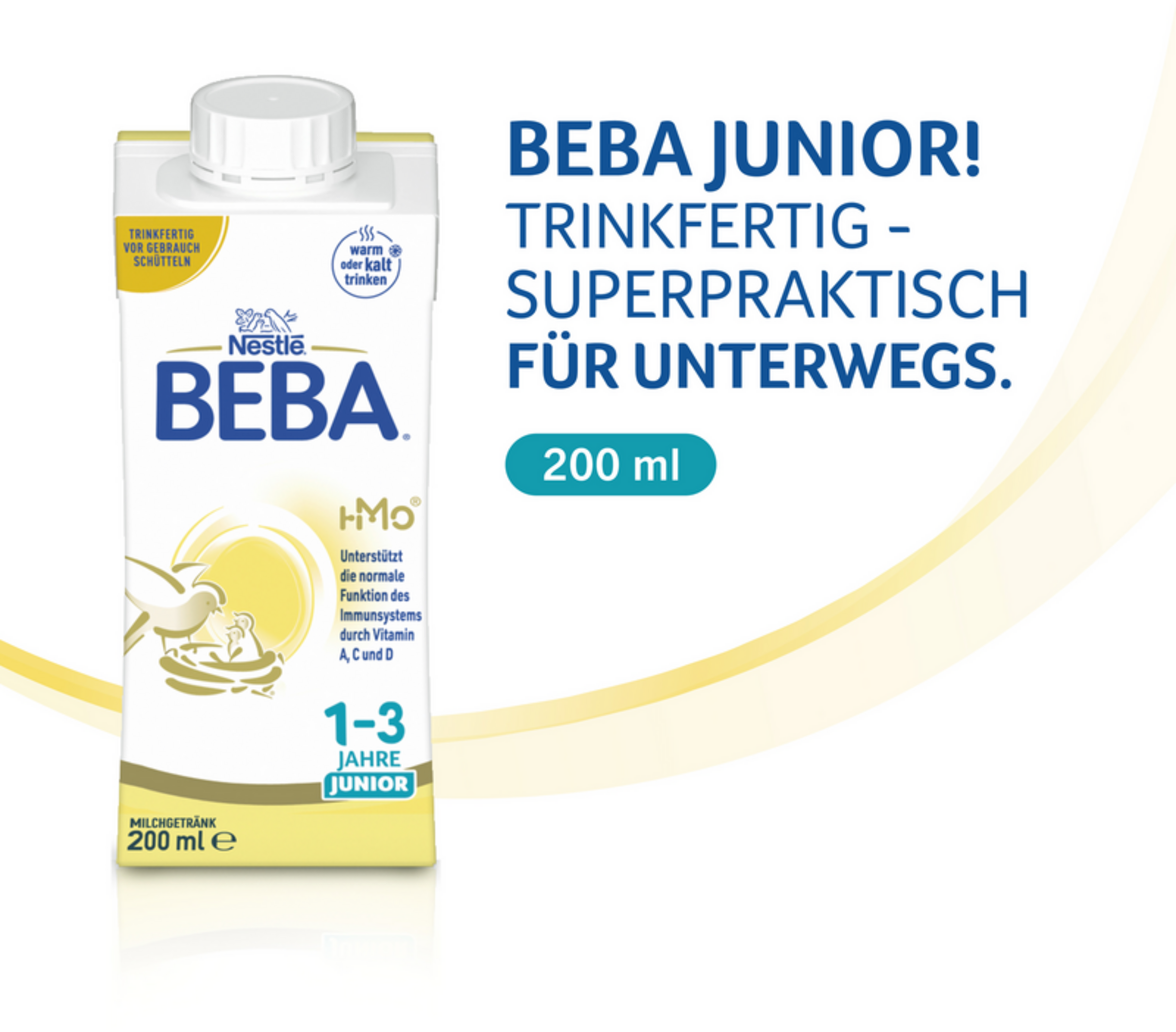 BEBA JUNIOR 1-3 Jahre ist auf die Bedürfnisse von Kindern ab 1 Jahr abgestimmt. Sie kann in diesem Alter jede andere Folgemilch ersetzen und eignet sich als gesundes Milchgetränk bis ins Kindesalter. Ernährungsexperten empfehlen, dass Kinder täglich ca. 300ml Milch trinken. BEBA JUNIOR 1-3 Jahre ist ab dem 1. Geburtstag zum Trinken aus der Tasse bestimmt. Wenn Du das Milchgetränk dennoch aus dem Fläschchen geben möchtest, überlasse dieses deinem Kind nicht zum Dauernuckeln.
