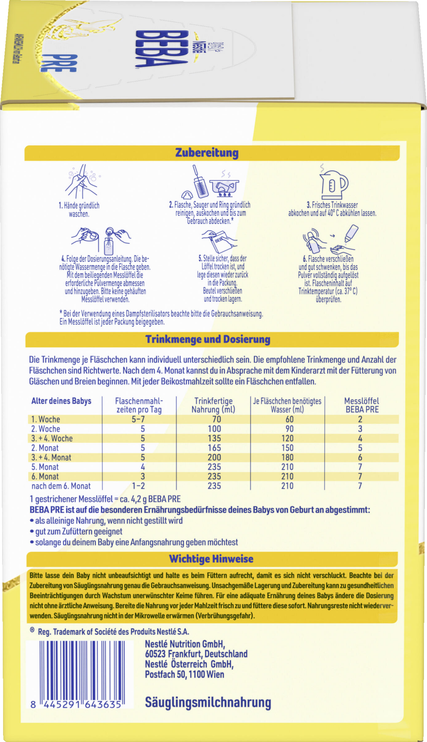 - BEBA Rezeptur: Die BEBA PRE Anfangsmilch ist von Geburt an auf die besonderen Ernährungsbedürfnisse deines Babys abgestimmt