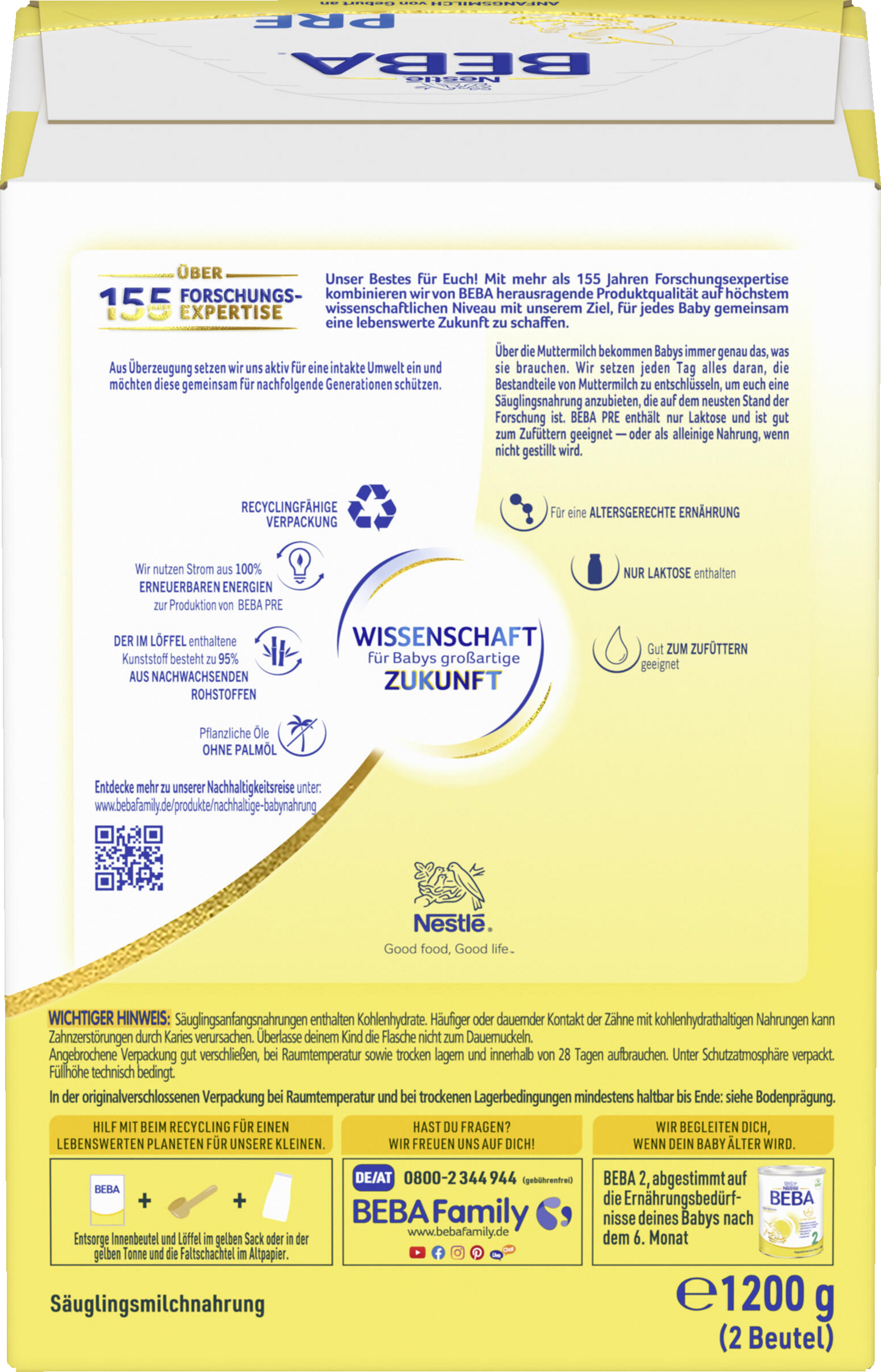 Das Beste für Euch! Mit mehr als 155 Jahren Forschungsexpertise kombiniert BEBA herausragende Produktqualität auf höchstem wissenschaftlichem Niveau mit dem Ziel, für jedes Baby gemeinsam eine lebenswerte Zukunft zu schaffen. BEBA PRE Anfangsmilch im 1,2kg Vorratspack ist auf die Bedürfnisse deines Babys von Geburt an abgestimmt.