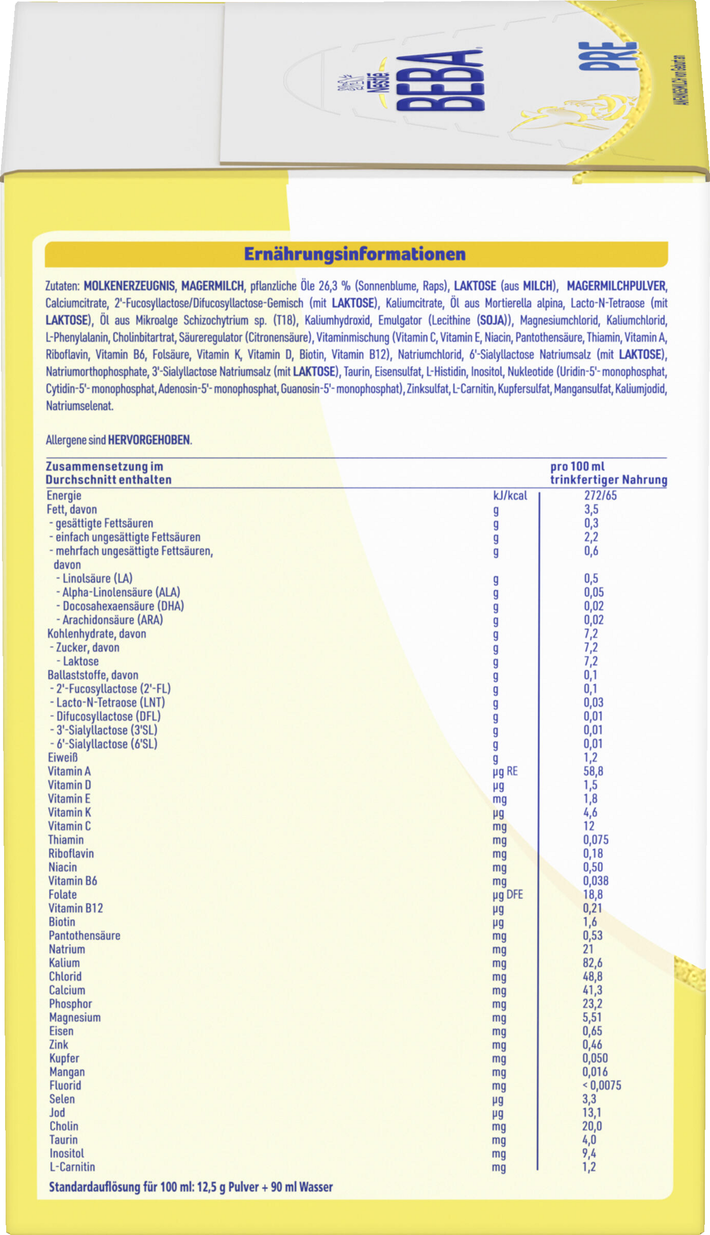 MOLKENERZEUGNIS, MAGERMILCH, pflanzliche Öle 26,3 % (Sonnenblume, Raps), LAKTOSE (aus MILCH), MAGERMILCHPULVER, Calciumcitrate, 2'-Fucosyllactose/Difucosyllactose-Gemisch (mit LAKTOSE), Kaliumcitrate, Öl aus Mortierella alpina, Lacto-N-Tetraose (mit LAKTOSE), Öl aus der Mikroalge Schizochytrium sp. (T 18), Kaliumhydroxid, Emulgator (Lecithine (SOJA)), Magnesiumchlorid, Kaliumchlorid, L-Phenylalanin, Cholinbitartrat, Säureregulator (Citronensäure), Vitaminmischung (Vitamin C, Vitamin E, Niacin, Pantothensäure, Thiamin, Vitamin A, Riboflavin, Vitamin B6, Folsäure, Vitamin K, Vitamin D, Biotin, Vitamin B12), Natriumchlorid, 6'-Sialyllactose Natriumsalz (mit LAKTOSE), Natriumorthophosphate, 3'-Sialyllactose Natriumsalz (mit LAKTOSE), Taurin, Eisensulfat, L-Histidin, Inositol, Nukleotide (Uridin-5'-monophosphat, Cytidin-5'-monophosphat, Adenosin-5'-monophosphat, Guanosin-5'-monophosphat), Zinksulfat, L-Carnitin, Kupfersulfat, Mangansulfat, Kaliumjodid, Natriumselenat.