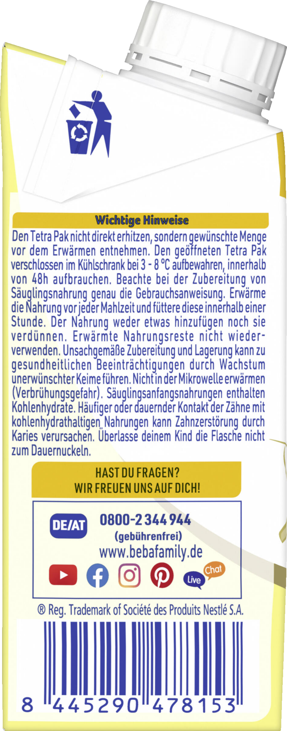 Den Tetra Pak nicht direkt erhitzen, sondern gewünschte Menge vor dem Erwärmen entnehmen. Beachte bei der Zubereitung von Säuglingsnahrung genau die Gebrauchsanweisung. Erwärme die Nahrung vor jeder Mahlzeit und füttere diese innerhalb einer Stunde. Der Nahrung nichts hinzufügen noch sie verdünnen. Erwärmte Nahrungsreste nicht wiederverwenden. Unsachgemäße Zubereitung und Lagerung kann zu gesundheitlichen Beeinträchtigungen durch Wachstum unerwünschter Keime führen. Nicht in der Mikrowelle erwärmen (Verbrühungsgefahr).
