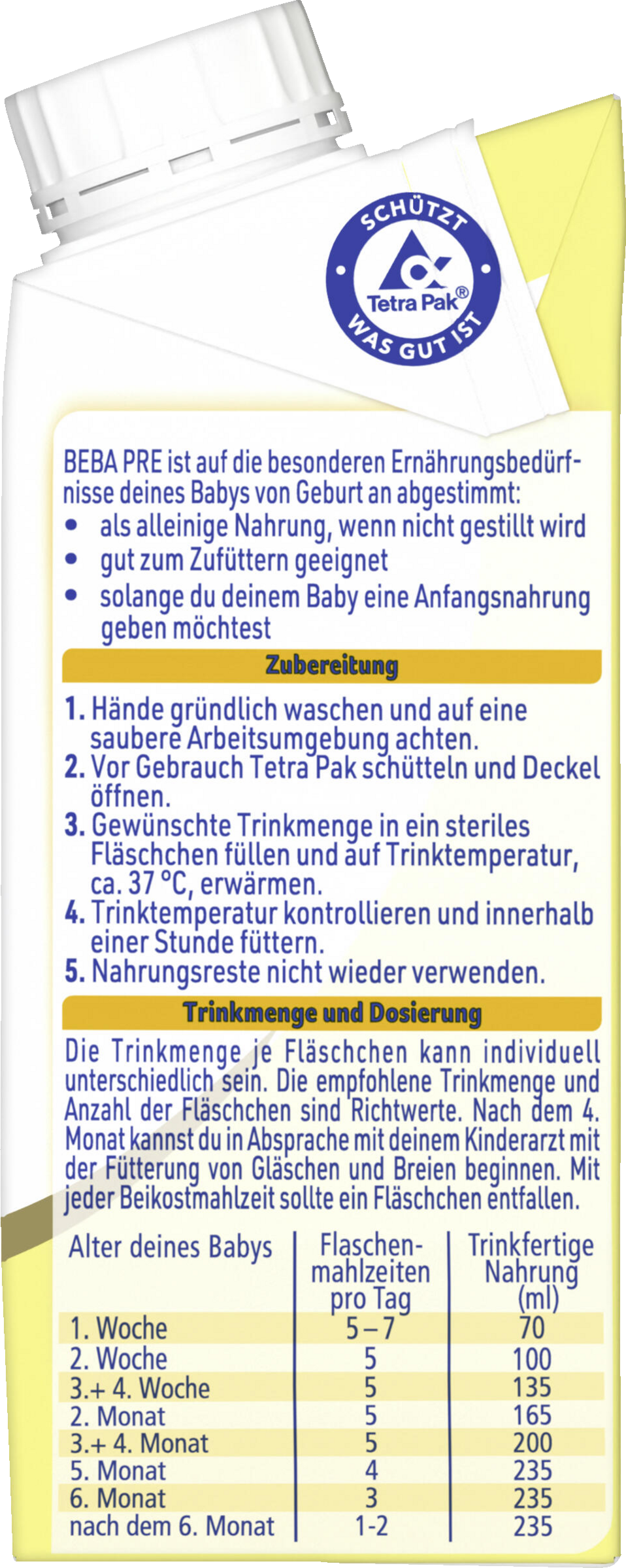 Trinkmenge und Dosierung: Die Trinkmenge je Fläschchen kann individuell unterschiedlich sein. Die empfohlene Trinkmenge und Anzahl der Fläschchen sind Richtwerte. Nach dem 4. Monat kannst du in Absprache mit dem Kinderarzt mit der Fütterung von Gläschen und Breien beginnen. Mit jeder Beikostmahlzeit sollte ein Fläschchen entfallen.