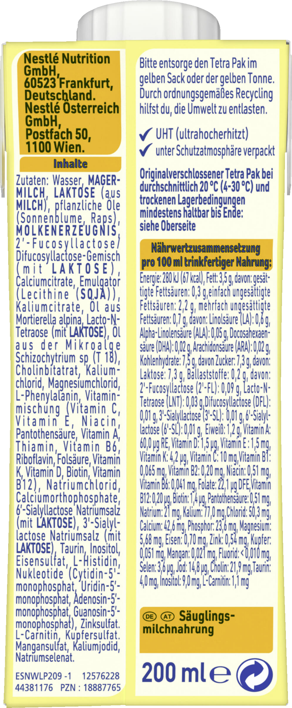 Wasser, MAGERMILCH, LAKTOSE (aus MILCH), pflanzliche Öle 3,2% (Sonnenblume, Raps), MOLKENERZEUGNIS, Calciumcitrate, 2'-Fucosyllactose (mit LAKTOSE), Emulgator (Lecithine) (SOJA), Kaliumcitrate, Öl aus Mortierella alpina, Öl aus der Mikroalge Schizochytrium sp. (T 18), Cholinbitartrat, Kaliumchlorid, Magnesiumchlorid, L-Phenylalanin, Vitaminmischung (Vitamin C, Vitamin E, Niacin, Pantothensäure, Vitamin A, Thiamin, Vitamin B6, Riboflavin, Folsäure, Vitamin K, Vitamin D, Biotin, Vitamin B12), Natriumchlorid, Calciumorthophosphate, Taurin, Inositol, Eisensulfat, L-Histidin, Nukleotide (Cytidin-5'-monophosphat, Uridin-5'-monophosphat, Adenosin-5'-monophosphat, Guanosin-5'-monophosphat), Zinksulfat, L-Carnitin, Kupfersulfat, Mangansulfat, Kaliumjodid, Natriumselenat.