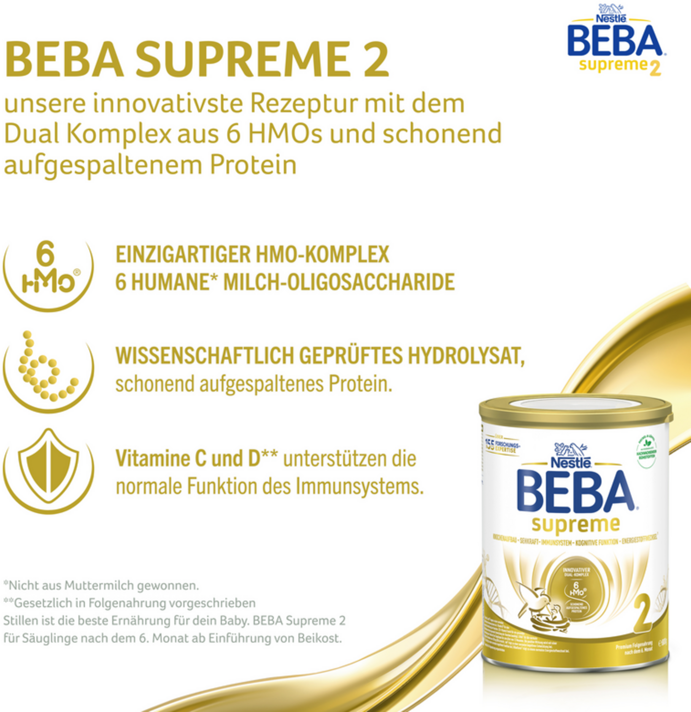 Die fortschrittlichste BEBA Rezeptur aller Zeiten. Vor über 150 Jahren entwickelte Heinrich Nestlé die allererste Säuglingsnahrung. Seitdem setzen ihre Wissenschaftler jeden Tag alles daran, die komplexen Bestandteile von Muttermilch zu entschlüsseln. BEBA SUPREME 2 basiert auf den neusten Erkenntnissen der Muttermilchforschung: Es enthält einen einzigartigen HMO-Komplex und ist die erste Säuglingsnahrung in Deutschland mit dieser besonderen Nährstoffkombination. Die 6 humanen* Milch-Oligosaccharide (HMO - 2'FL, DFL, LNT, 3'-SL, 6'-SL, 3'FL) sind einzigartige Bausteine und identisch mit denen, die natürlicherweise in Muttermilch vorkommen. BEBA SUPREME 2 unterstützt die normale Gehirn- und Nervenzellenentwicklung durch die essenzielle Omega-3-Fettsäure Alpha-Linolensäure (ALA), enthält schonend aufgespaltenes Protein (Hydrolysat) und pflanzliche Öle ohne Palmöl.