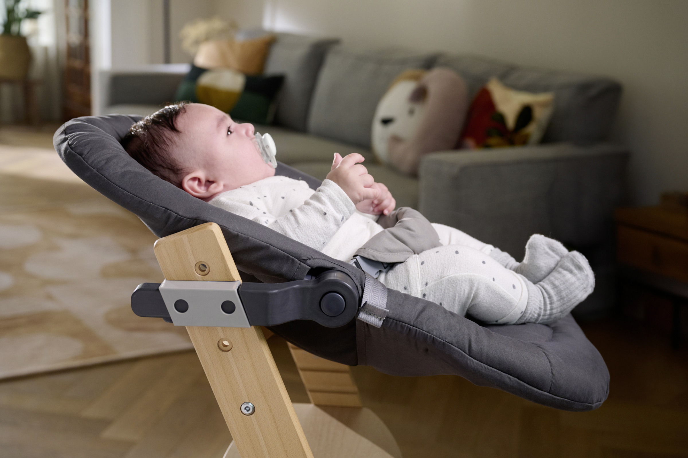 2-in-1-Babywippe mit 2 Liegepositionen kann am Timba Hochstuhl oder Wippengestell befestigt werden.