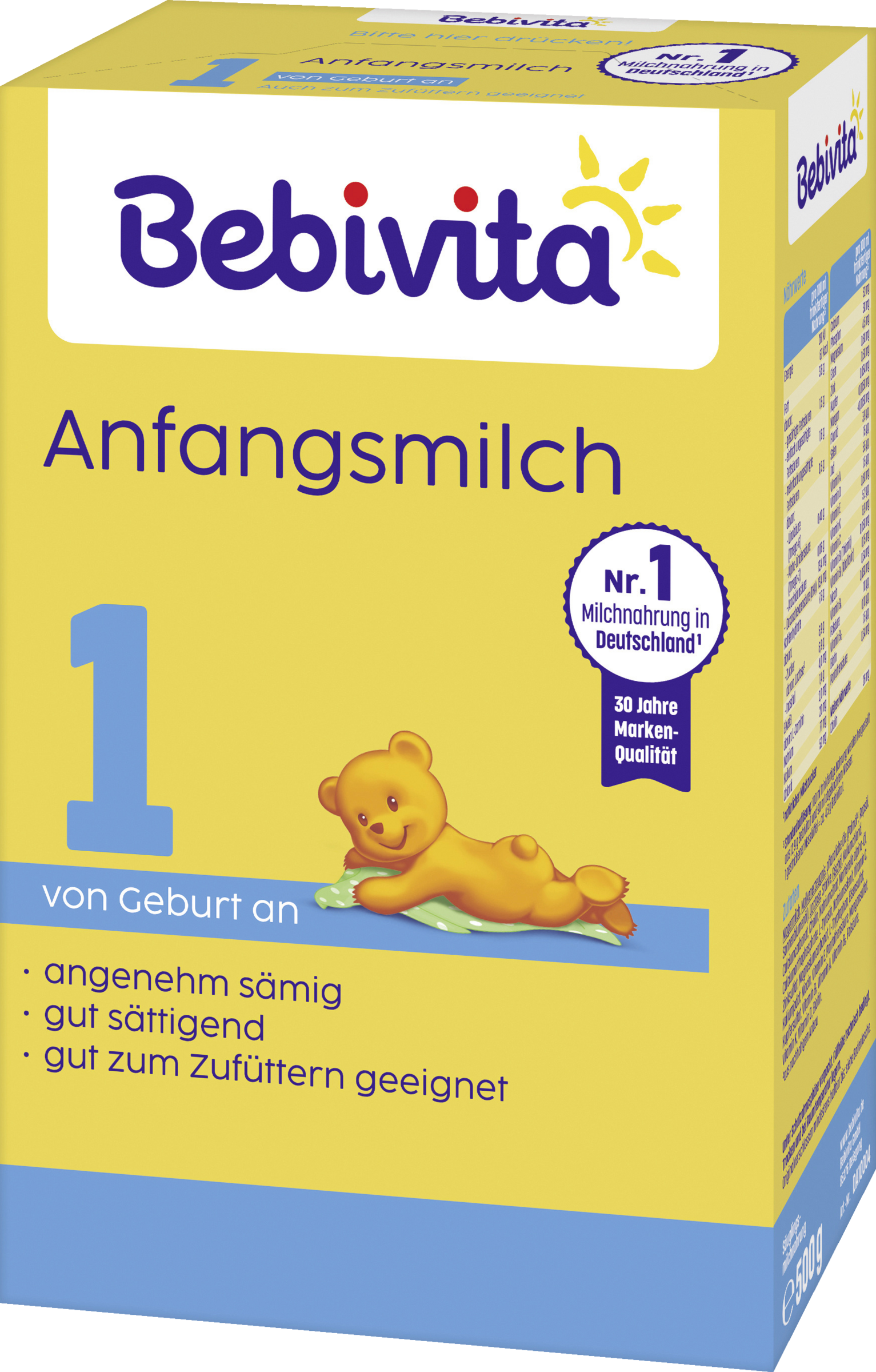 Muttermilch ist die beste Ernährung für dein Baby. Wenn du eine Säuglingsmilchnahrung verwenden willst, sprich bitte mit deiner Klinik oder deinem Kinderarzt. Wie Muttermilch enthält auch Bebivita 1 Kohlenhydrate, die ein wesentlicher Bestandteil in der Ernährung deines Kindes sind. Bei andauerndem Kontakt von Zähnen mit kohlenhydrathaltiger Nahrung können schwere Zahnschäden (Karies) ausgelöst werden. Achte deshalb darauf, dass dein Baby – wie bei einer Stillmahlzeit – nicht länger als für die Trinkmahlzeit nötig an der Flasche nuckelt. Gib deinem Baby die Flasche nicht als Schnullerersatz oder zum Dauernuckeln. Lasse dein Kind so früh wie möglich aus der Tasse trinken. #von Geburt an #Unter Schutzatmosphäre verpackt. Füllhöhe technisch bedingt.
