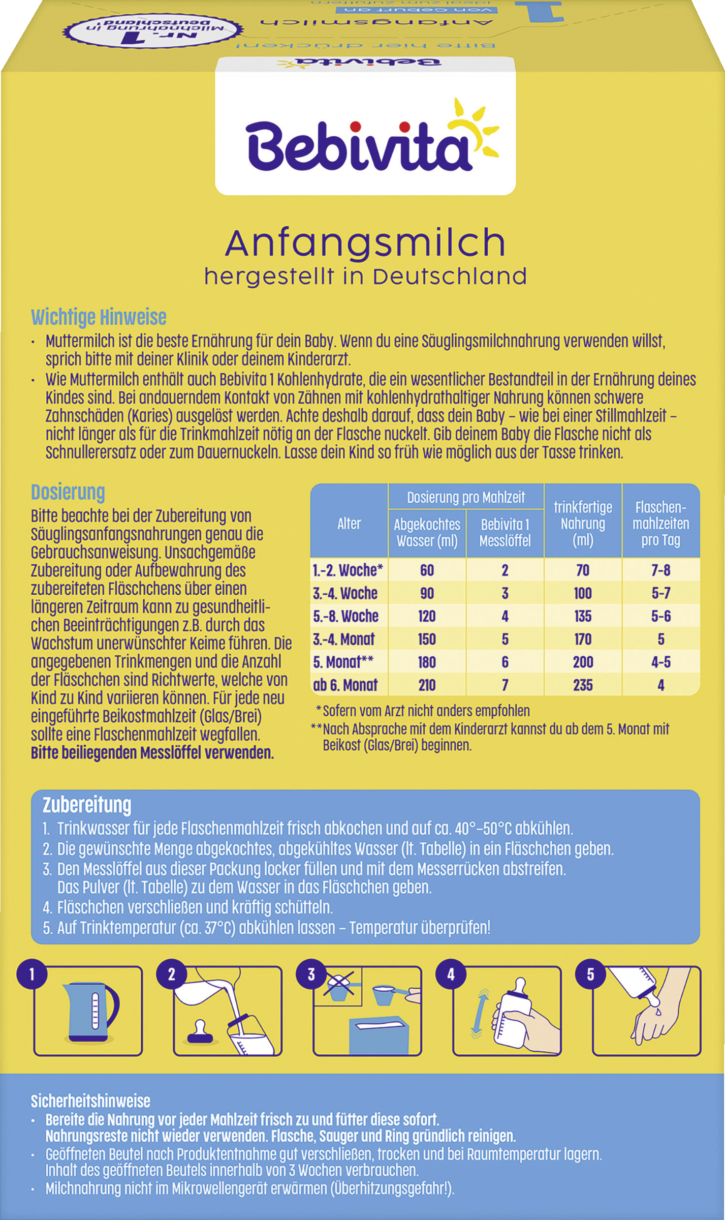 Dosierung Bitte beachte bei der Zubereitung von Säuglingsanfangsnahrungen genau die Gebrauchsanweisung. Unsachgemäße Zubereitung oder Aufbewahrung des zubereiteten Fläschchens über einen längeren Zeitraum kann zu gesundheitlichen Beeinträchtigungen z.B. durch das Wachstum unerwünschter Keime führen. Die angegebenen Trinkmengen und die Anzahl der Fläschchen sind Richtwerte, welche von Kind zu Kind variieren können. Für jede neu eingeführte Beikostmahlzeit (Glas/Brei) sollte eine Flaschenmahlzeit wegfallen. Bitte beiliegenden Messlöffel verwenden. Zubereitung:
