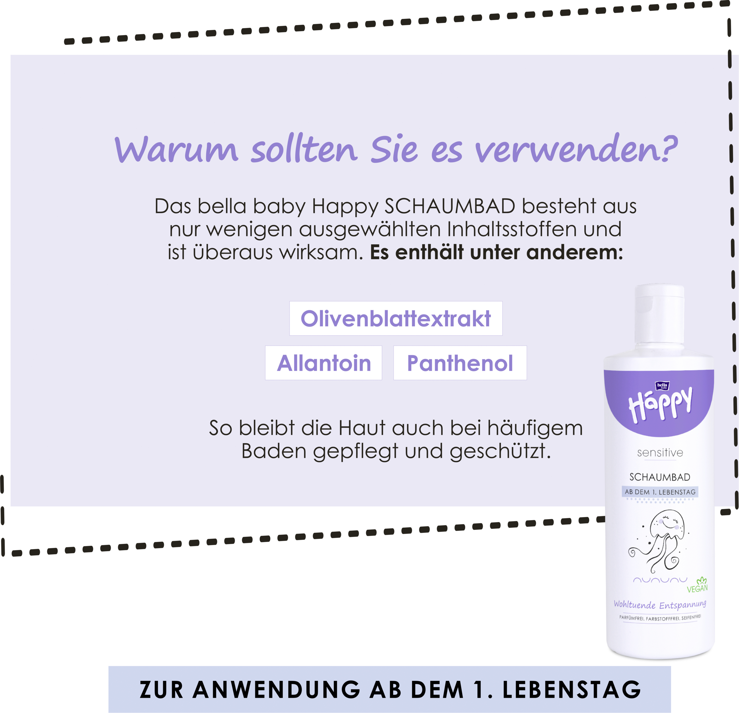 bella baby Happy Sensitive Schaumbad wird das Badeerlebnis deines Babys zu einem sanften Vergnügen. Speziell entwickelt für die empfindliche Haut deines kleinen Lieblings, bietet unser Schaumbad die perfekte Mischung aus sanfter Reinigung und Pflege. Einfach eine kleine Menge ins Badewasser geben, und schon entsteht ein zarter Schaum, der die Haut deines Babys sanft umhüllt. Das bella baby Happy Sensitive Schaumbad ist nicht nur eine Wohltat für die Haut, sondern macht das Baden auch zu einem entspannenden Ritual.
