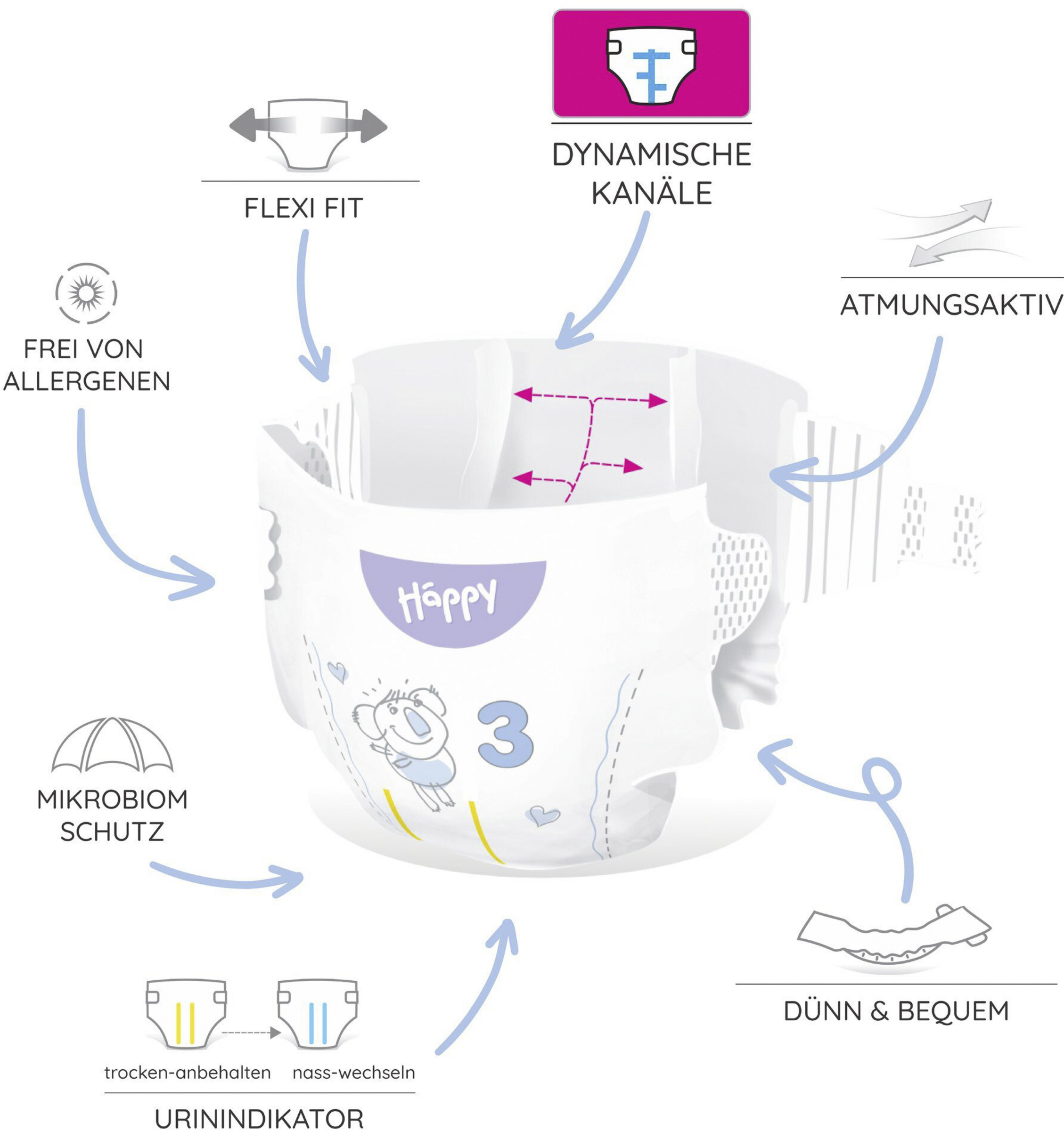 Die neuen bella baby Happy soft & delicate Windeln – jetzt noch besser! Verbesserte Qualität mit dynamischen Kanälen: Unsere neueste Technologie sorgt für noch schnellere Flüssigkeitsverteilung – für ein angenehmes, trockenes Gefühl und zuverlässigen Schutz.