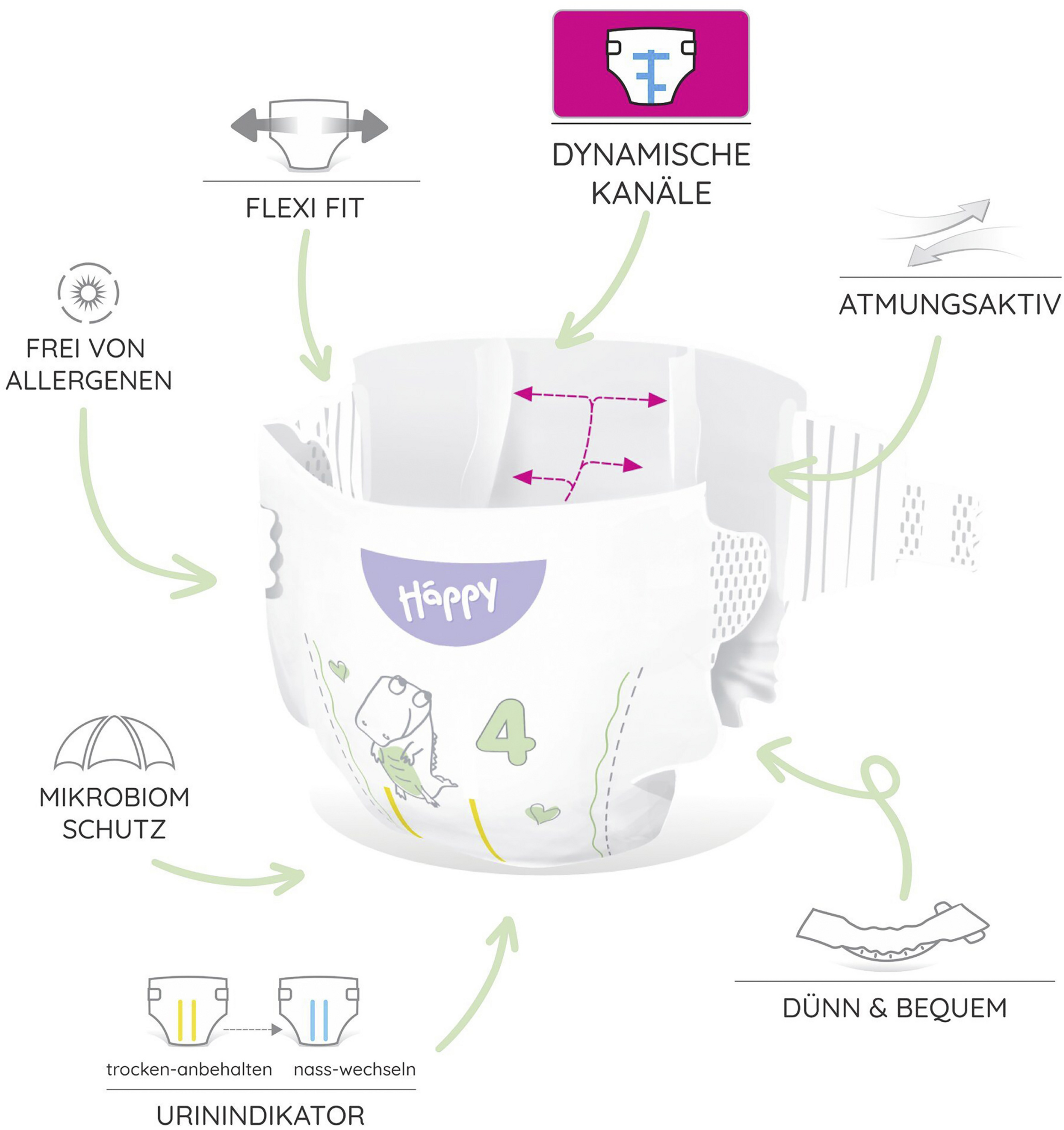 Die neuen bella baby Happy soft & delicate Windeln – jetzt noch besser! Verbesserte Qualität mit dynamischen Kanälen: Unsere neueste Technologie sorgt für noch schnellere Flüssigkeitsverteilung – für ein angenehmes, trockenes Gefühl und zuverlässigen Schutz.