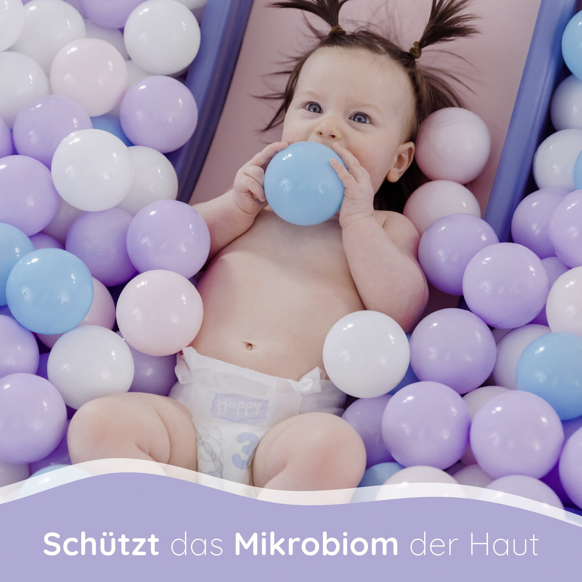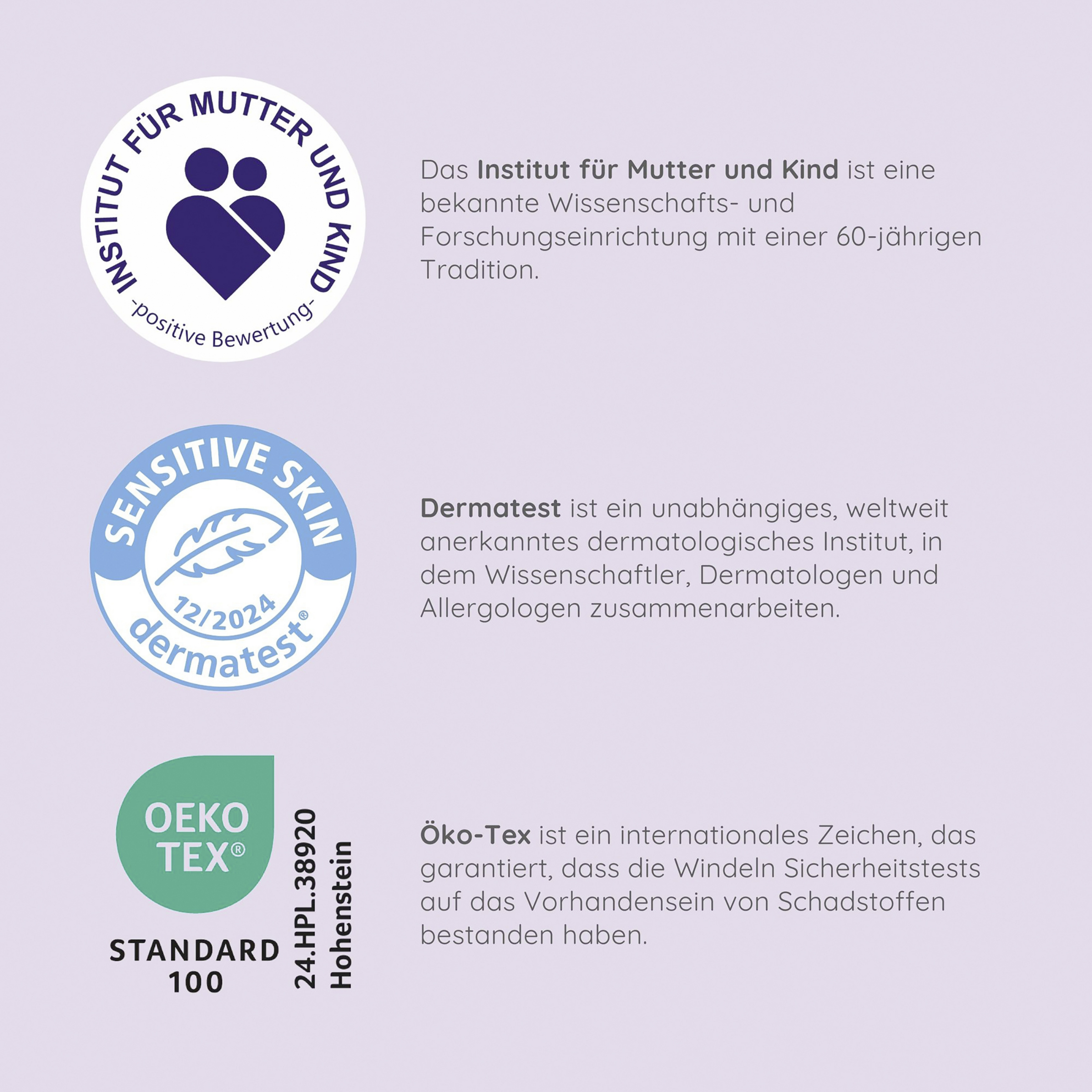 Dermatologisch bestätigt hautfreundlich: Die atmungsaktiven Windeln sind frei von Duftstoffen und Allergenen und besonders sanft zur Babyhaut. Bestätigt von dermatest, dem Institut für Mutter und Kind sowie Oeko-Tex – für ein gesundes Hautmikrobiom.