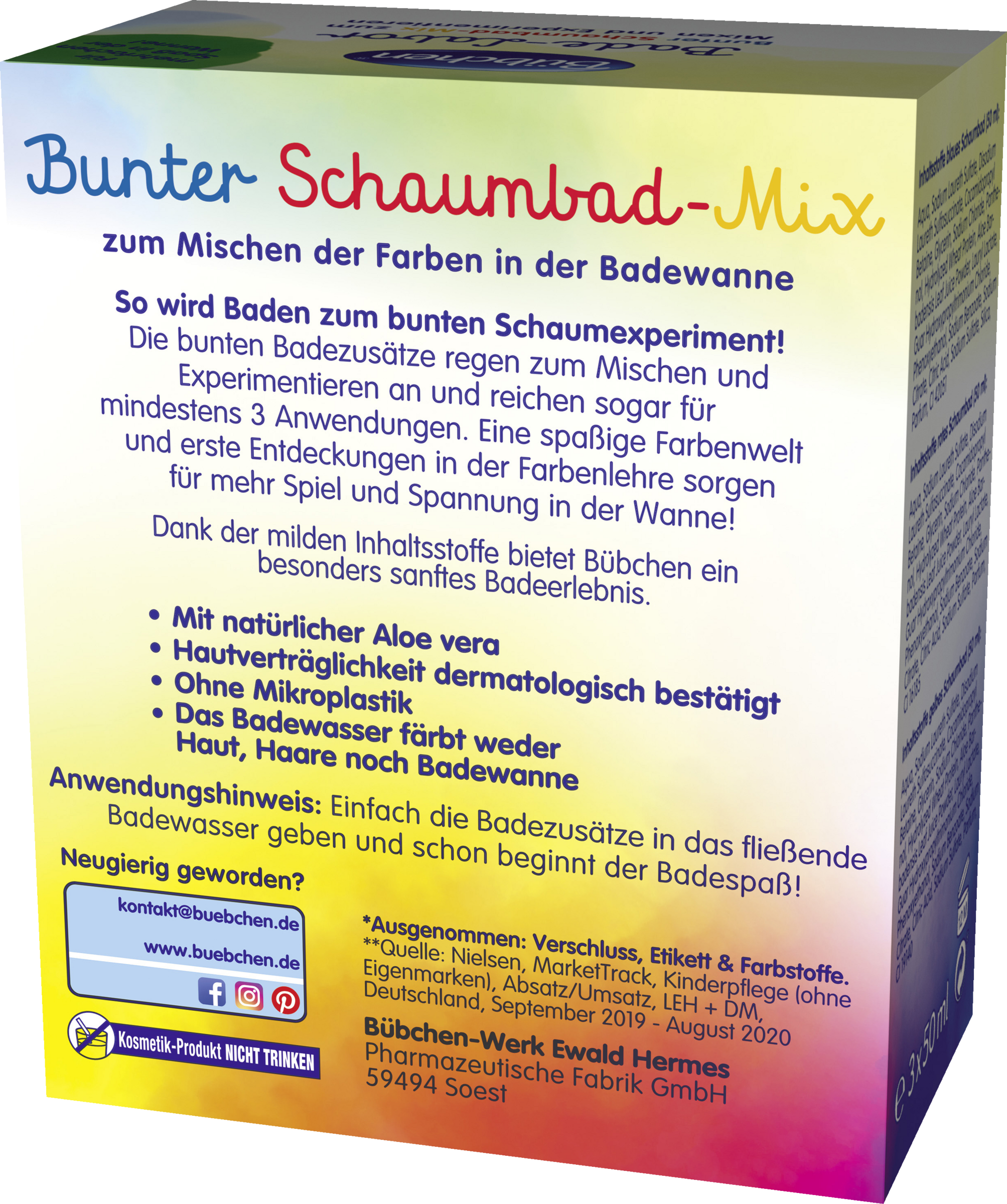 Bunter Schaumbad-Mix zum Mischen der Farben in der Badewanne - so wird Baden zum bunten Schaumexperiment! Die bunten Badezusätze regen zum Mischen und Experimentieren an und reichen sogar für mindestens 3 Anwendungen. Eine spaßige Farbenwelt und erste Entdeckungen in der Farbenlehre sorgen für mehr Spiel und Spannung in der Wanne!