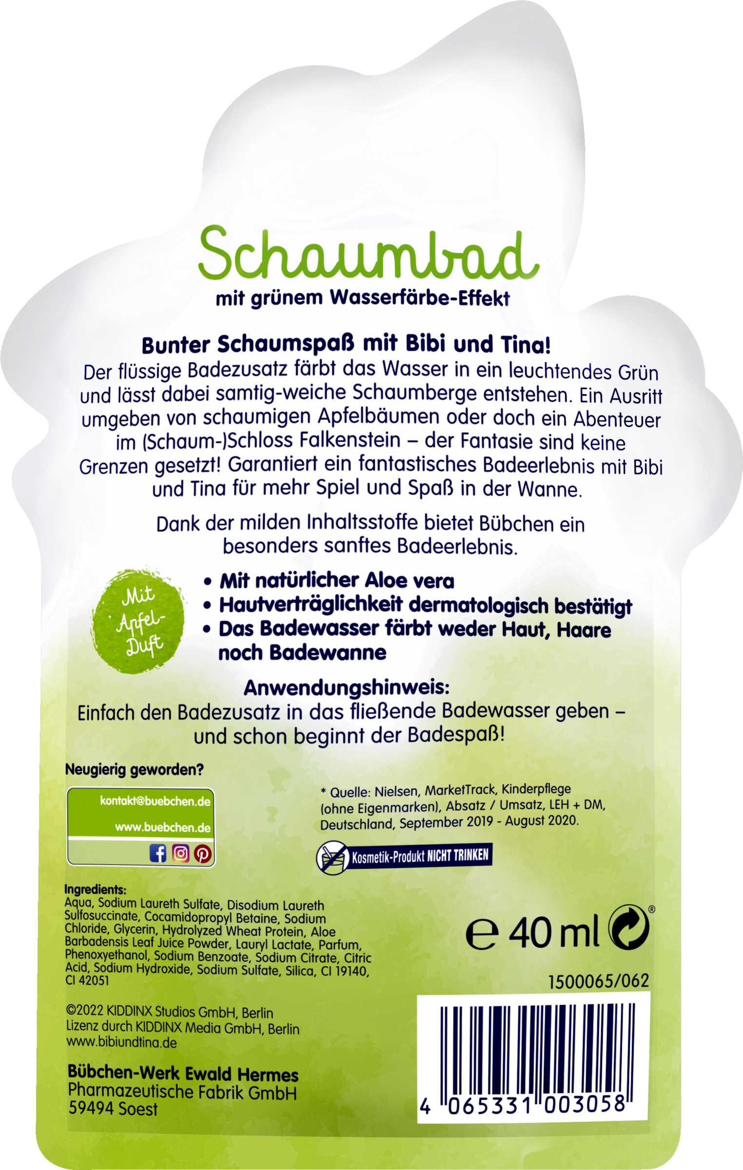 Der flüssige Badezusatz färbt das Wasser in ein leuchtendes Grün und lässt dabei fluffig-weiche Schaumberge entstehen. Ein Ausritt umgeben von schaumigen Apfelbäumen oder doch ein Abenteuer im (Schaum-) Schloss Falkenstein, der Phantasie sind keine Grenzen gesetzt! Garantiert ein fantastisches Badeerlebnis mit Bibi und Tina für mehr Spiel und Spaß in der Wanne.