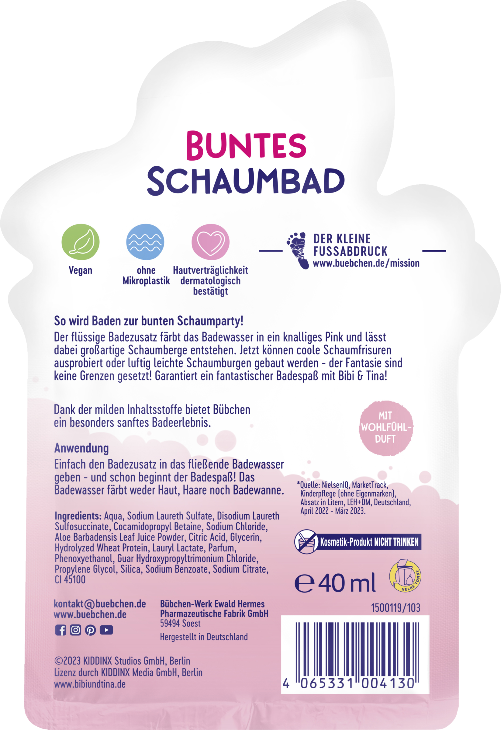 Der flüssige Badezusatz färbt das Badewasser in ein knalliges Pink und lässt dabei großartige Schaumberge entstehen. Jetzt können coole Schaumfrisuren ausprobiert oder luftig leichte Schaumburgen gebaut werden - der Fantasie sind keine Grenzen gesetzt! Garantiert ein fantastischer Badespaß mit Bibi & Tina!