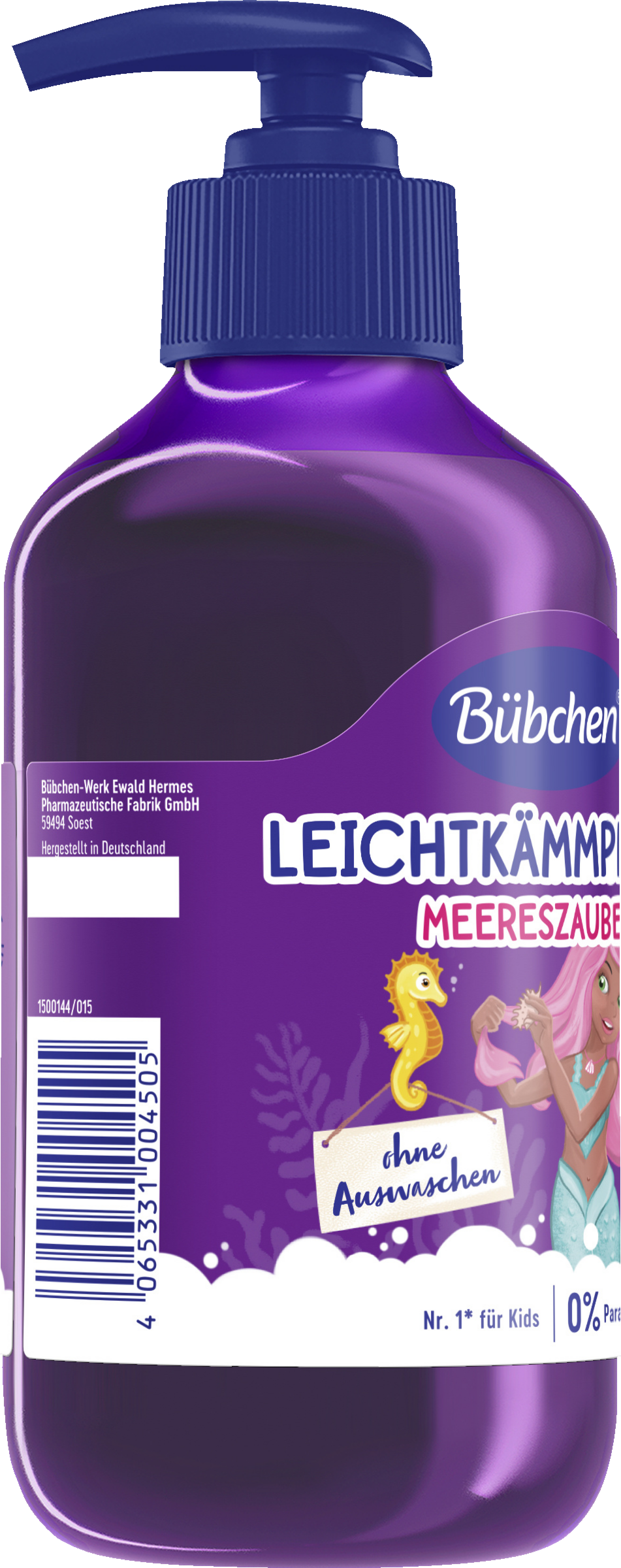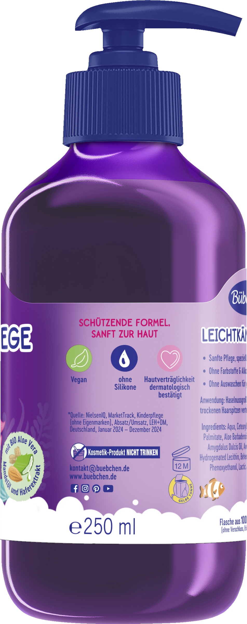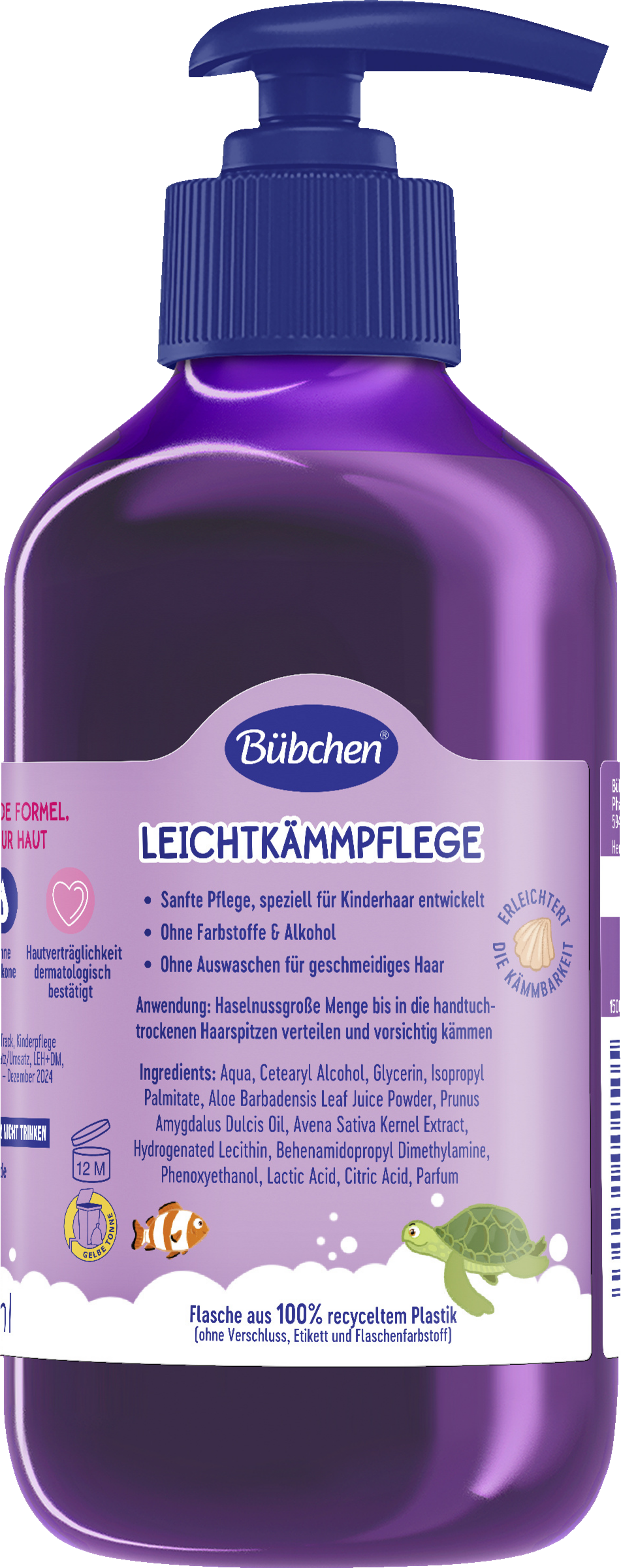 Die brandneue Bübchen Leichtkämmpflege verzaubert nicht nur mit einem frischen Duft, sondern sorgt auch für mühelose Kämmbarkeit. Einfach nach dem Waschen in die handtuch-trockenen Haare einarbeiten und vorsichtig auskämmen – ganz ohne Ausspülen. Ideal für die tägliche Pflege, die das das Haar sanft entwirrt und gleichzeitig pflegt.