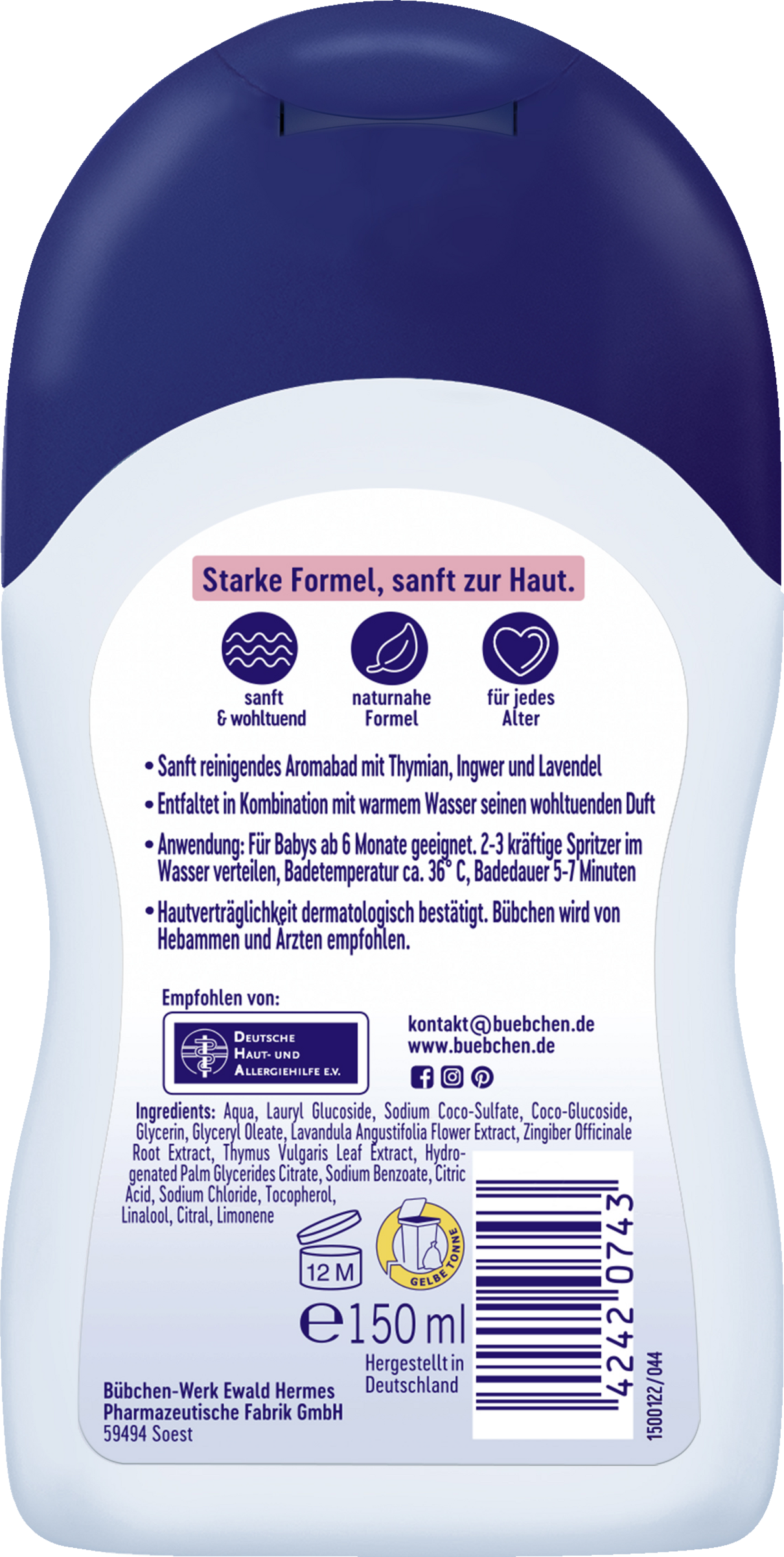 Bübchen SOS Erkältungszeitbad reinigt sanft zarte Babyhaut. In Kombination mit warmem Wasser entfaltet die naturnahe Formel ihren wohltuenden Duft aus Thymian, Ingwer und Lavendel.