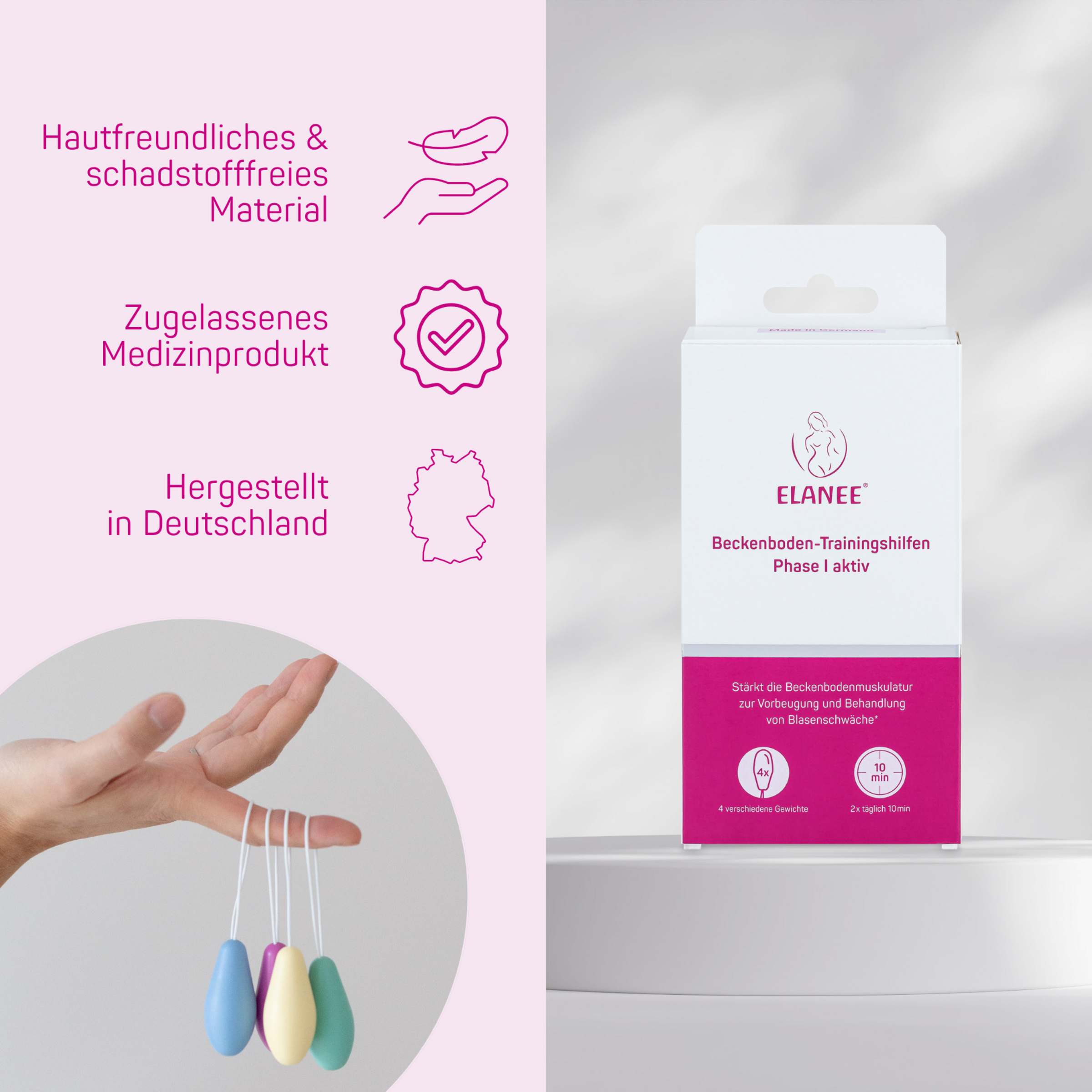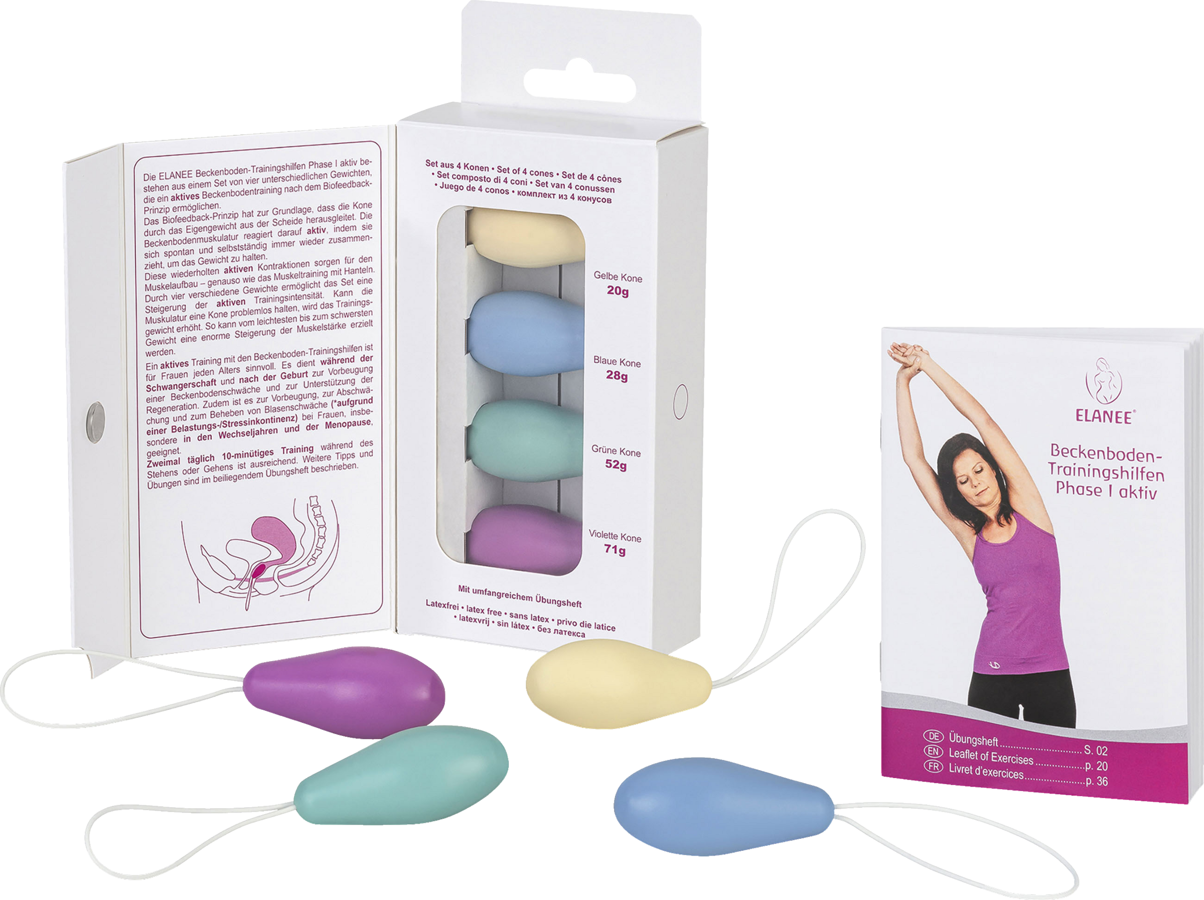 Das Training mit den ELANEE Beckenboden-Trainingshilfen Phase I aktiv fördert die Wahrnehmung des Beckenbodens und stärkt die Beckenbodenmuskulatur. Durch regelmäßiges Training kann Blasenschwäche (Belastungs-/Stressinkontinenz) gebessert, behoben oder vorbeugend verhindert werden. Die BeckenbodenTrainingshilfen Phase I aktiv sind ein in Deutschland hergestelltes Medizinprodukt und bestehen aus einem Set mit vier gleich großen tamponförmigen Konen mit Rückholbändchen zum vaginalen Einführen. Die Vaginalkonen haben unterschiedliche Farben und Gewichte: gelb 20 g, blau 28 g, grün 52 g, violett 71 g. Dem Produkt ist ein Übungsheft mit Trainingsanleitungen beigelegt.