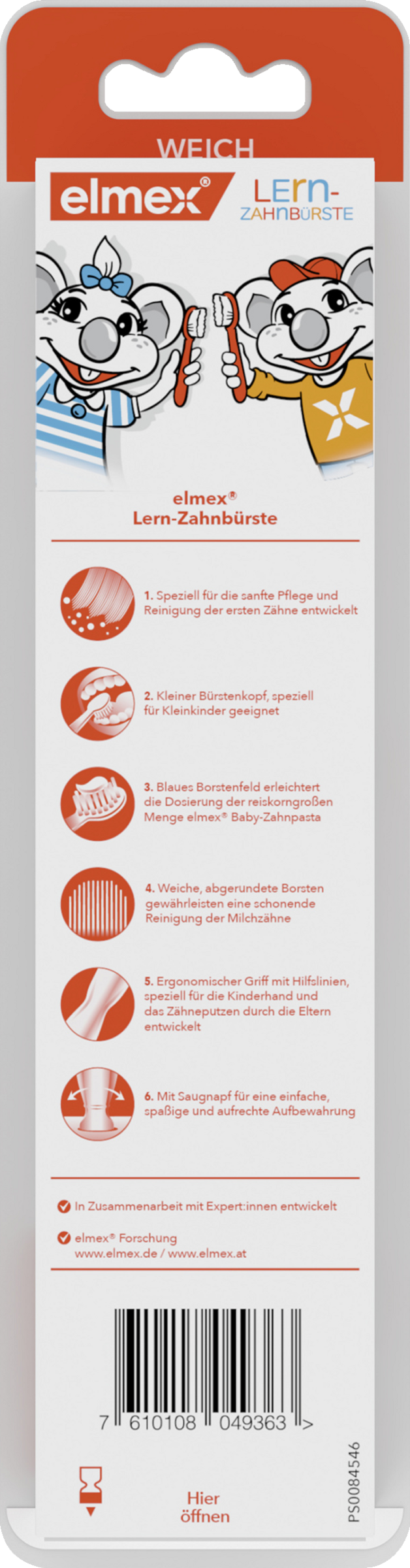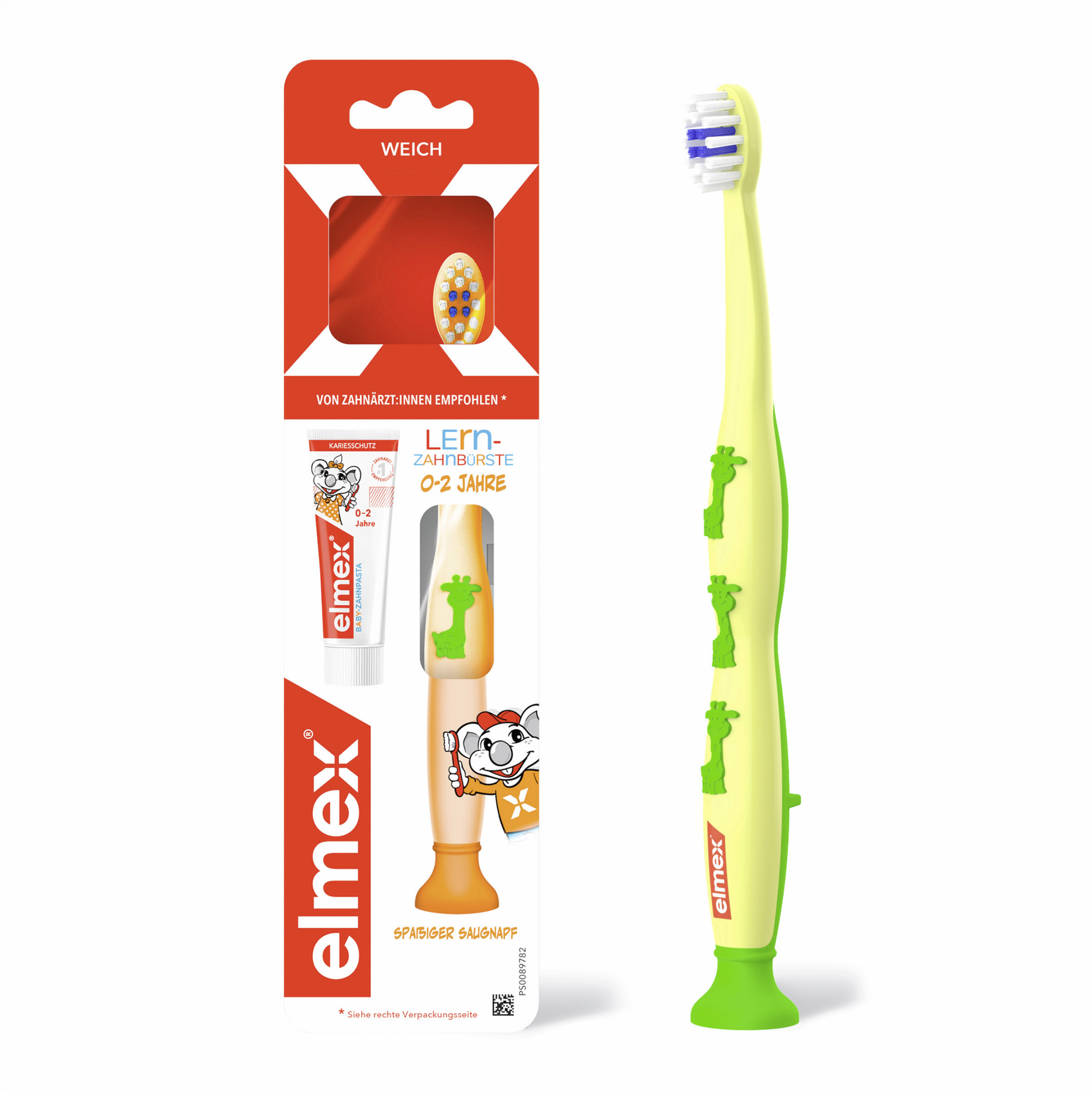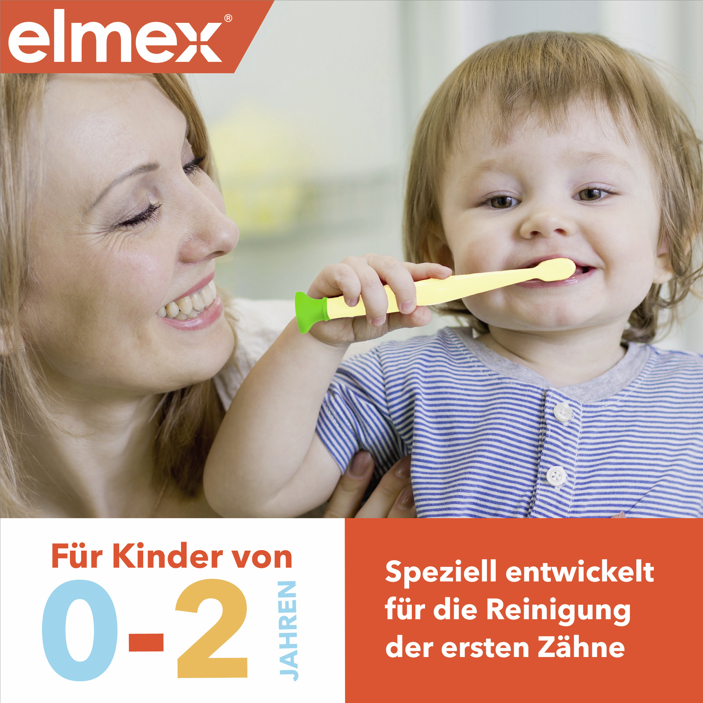 Die elmex Lern-Zahnbürste 0-2 Jahre ist speziell für die schonende Reinigung und Pflege der ersten Zähne entwickelt worden. Der kleine Bürstenkopf ist speziell für Kleinkinder geeignet. Das blaue Borstenfeld erleichtert die Dosierung der erbsengrossen Menge Kinder-Zahnpasta. Weiche, abgerundete Borsten gewährleisten eine schonende Reinigung der Milchzähne. Der Griff ist ergonomisch geformt und speziell für die Kinderhand und das Zähneputzen durch die Eltern entwickelt. Mit Saugnapf für eine einfache, spaßige und aufrechte Aufbewahrung.