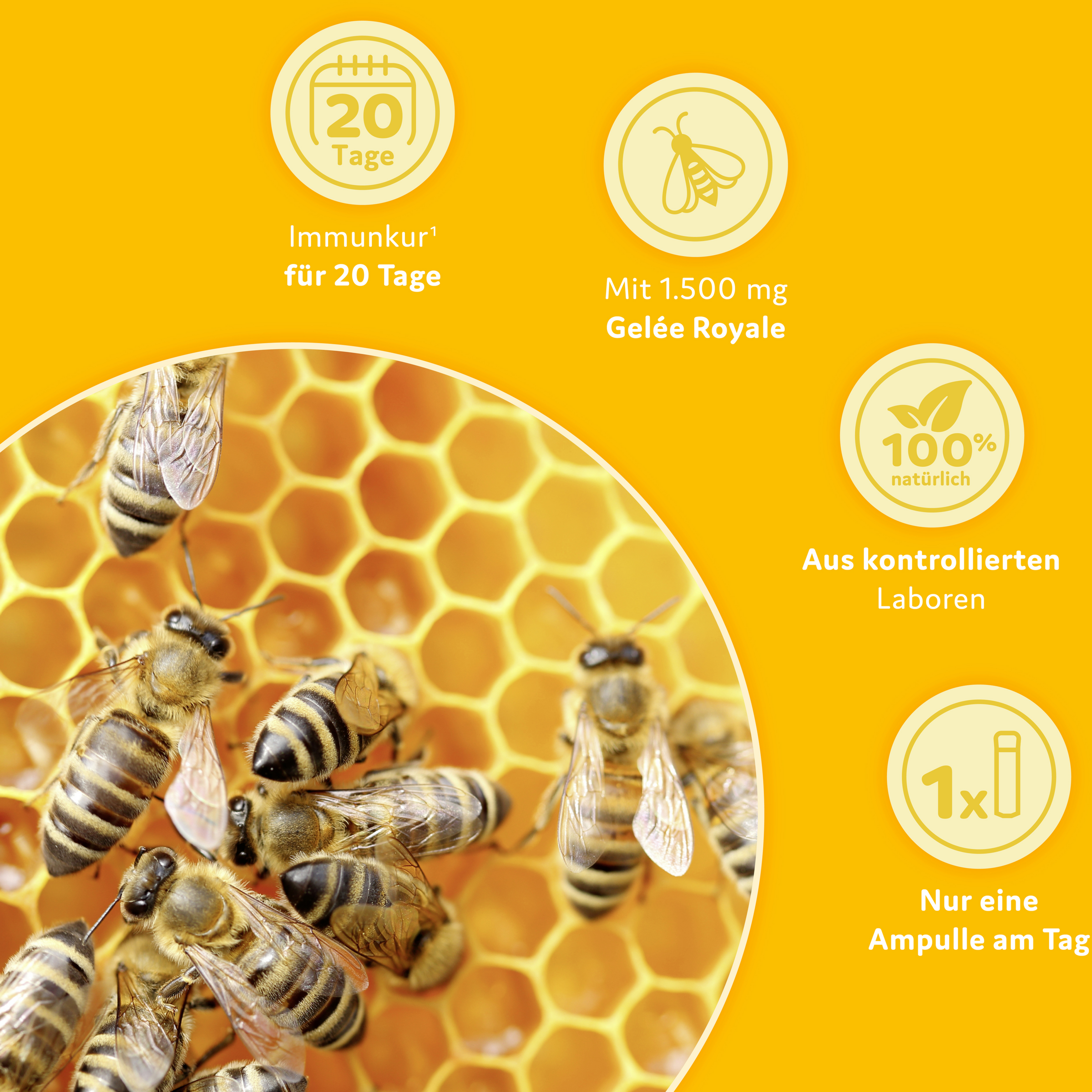 Gelée Royale ist ein wertvolles, von Bienen hergestelltes Naturprodukt. Es dient der Ernährung der Bienenkönigin. Dadurch kann sie täglich bis zu 2.000 Eier legen und als Einzige 50-mal länger als ihre Artgenossinnen leben. Deshalb ist die Bienenkönigin zum Symbol von Vitalität, Leistungs- und Lebenskraft geworden.