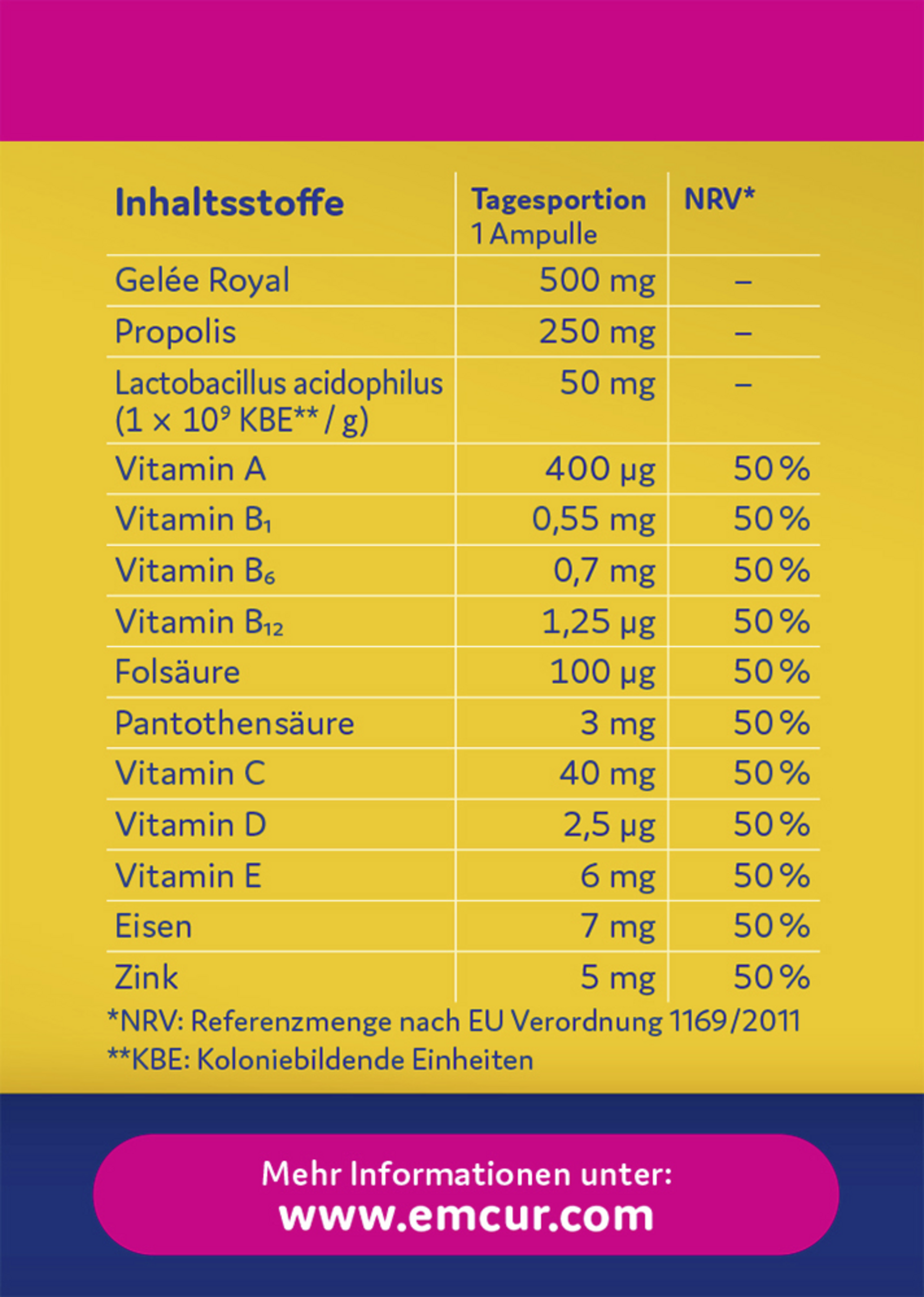 | Tagesdosis Referenzwert | 1 Ampulle am Tag | |