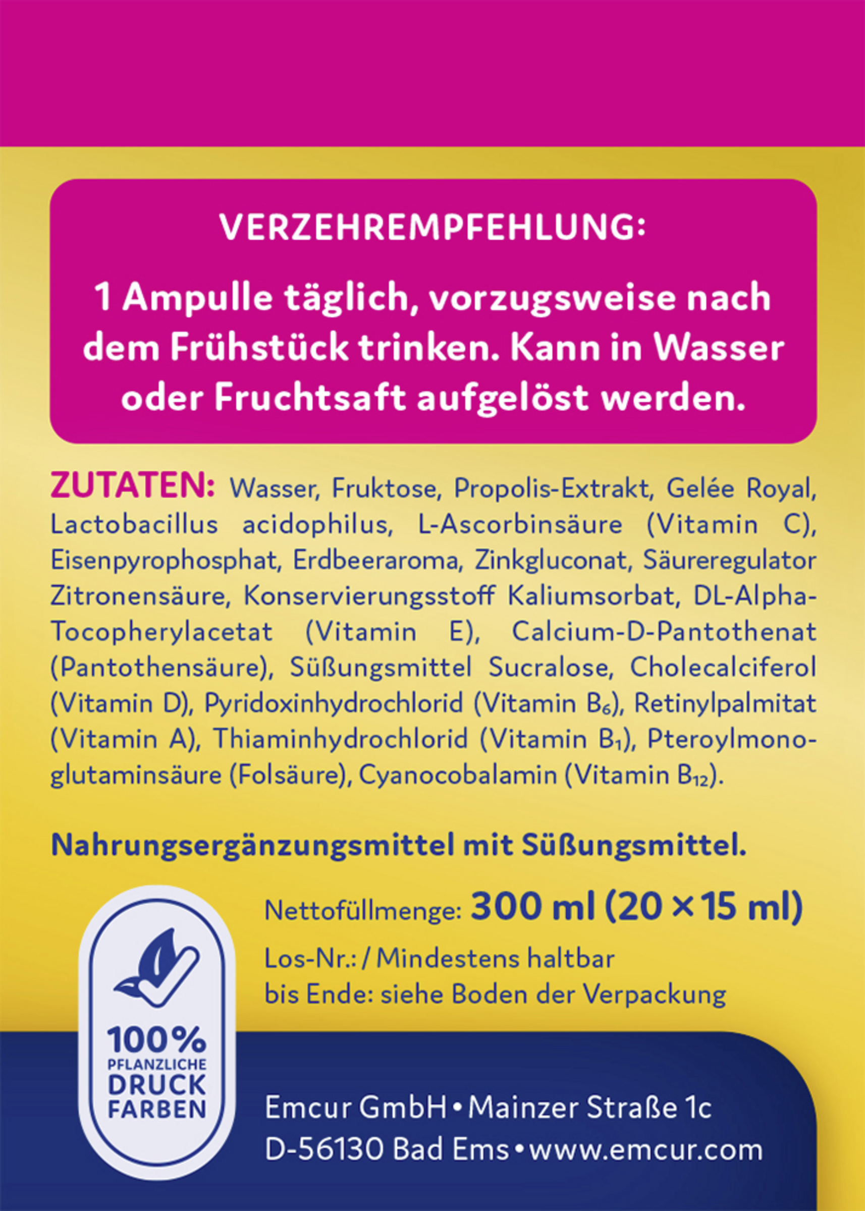 Wasser, Fruktose, Propolis-Extrakt, Gelée Royale, Lactobacillus acidophilus, L-Ascorbinsäure (Vitamin C), Eisenpyrophosphat, Erdbeeraroma, Zinkgluconat, Säureregulator Zitronensäure, Konservierungsstoff Kaliumsorbat, DL-Alpha-Tocopherylacetat (Vitamin E), Calcium-D-Pantothenat (Pantothensäure), Süßungsmittel Sucralose, Cholecalciferol (Vitamin D), Pyridoxinhydrochlorid (Vitamin B6), Retinylpalmitat (Vitamin A), Thiaminhydrochlorid (Vitamin B1), Pteroylmonoglutaminsäure (Folsäure), Cyanocobalamin (Vitamin B12)