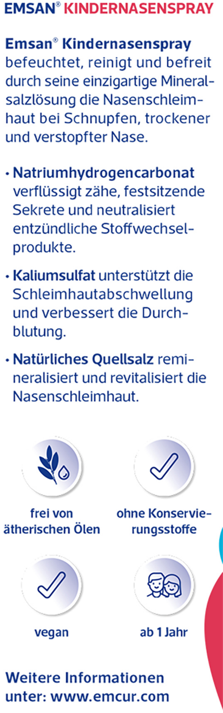 Beim Emsan® Kindernasenspray besteht keine Gefahr von Abhängigkeit und medikamentösem Schnupfen. Das Kindernasenspray ist frei von Konservierungsstoffen und nach Anbruch dennoch 6 Monate anwendbar. Es ist zudem garantiert frei von Treibgasen und allergieauslösenden pflanzlichen Substanzen. Es ist für Schwangere, Stillende und für Kinder ab 1 Jahr geeignet.