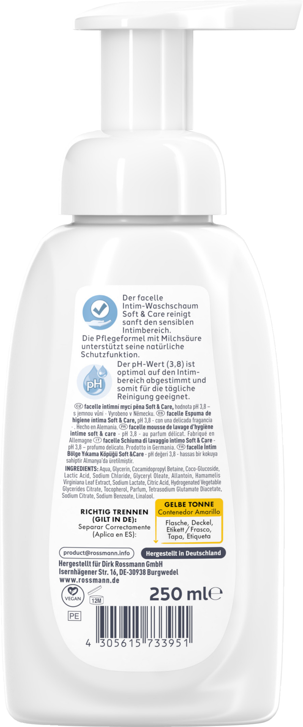 Der facelle Intim-Waschschaum Soft & Care mit Feuchtigkeits-Komplex wurde für die Reinigung des sensiblen Intimbereichs entwickelt. Die Pflegeformel mit Milchsäure unterstützt seine natürliche Schutzfunktion.