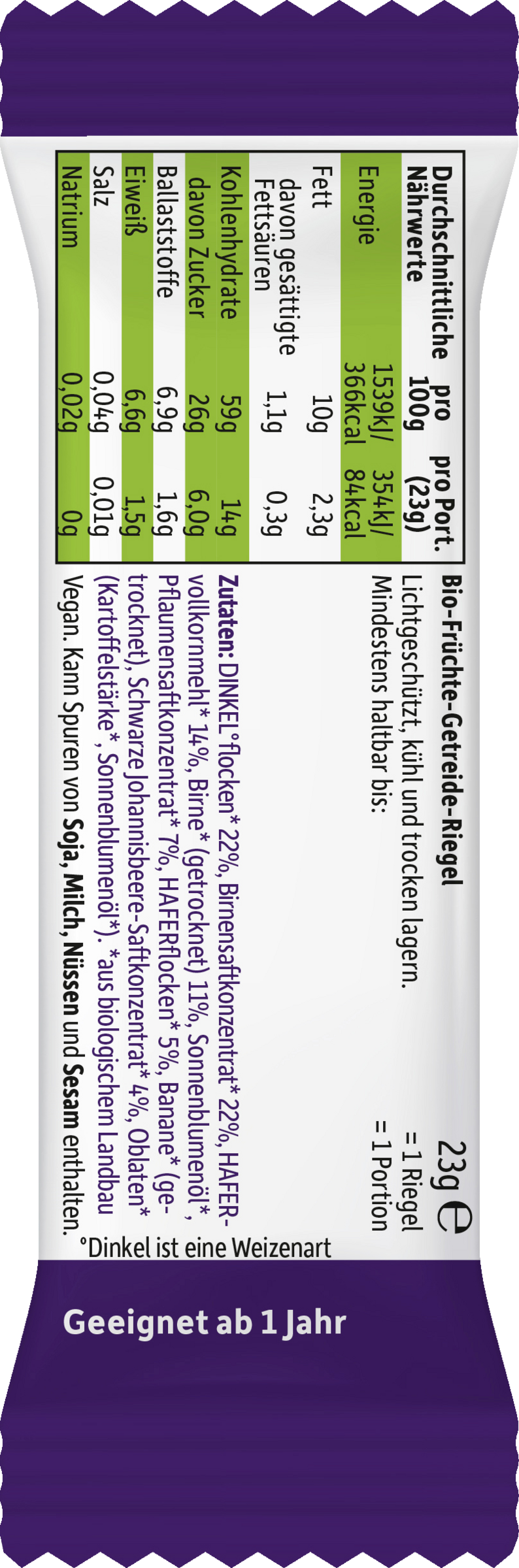 DINKELflocken* 22%, Birnensaftkonzentrat* 22%, HAFERvollkornmehl* 14%, Birne*(getrocknet) 11%, Sonnenblumenöl* Pflaumensaftkonzentrat* 7%, HAFERflocken* 5%, Banane* (getrocknet), schwarze Johannisbeere-Saftkonzentrat* 4%, Oblaten* (Kartoffelstärke*, Sonnenblumenöl*).*aus biologischem Landbau