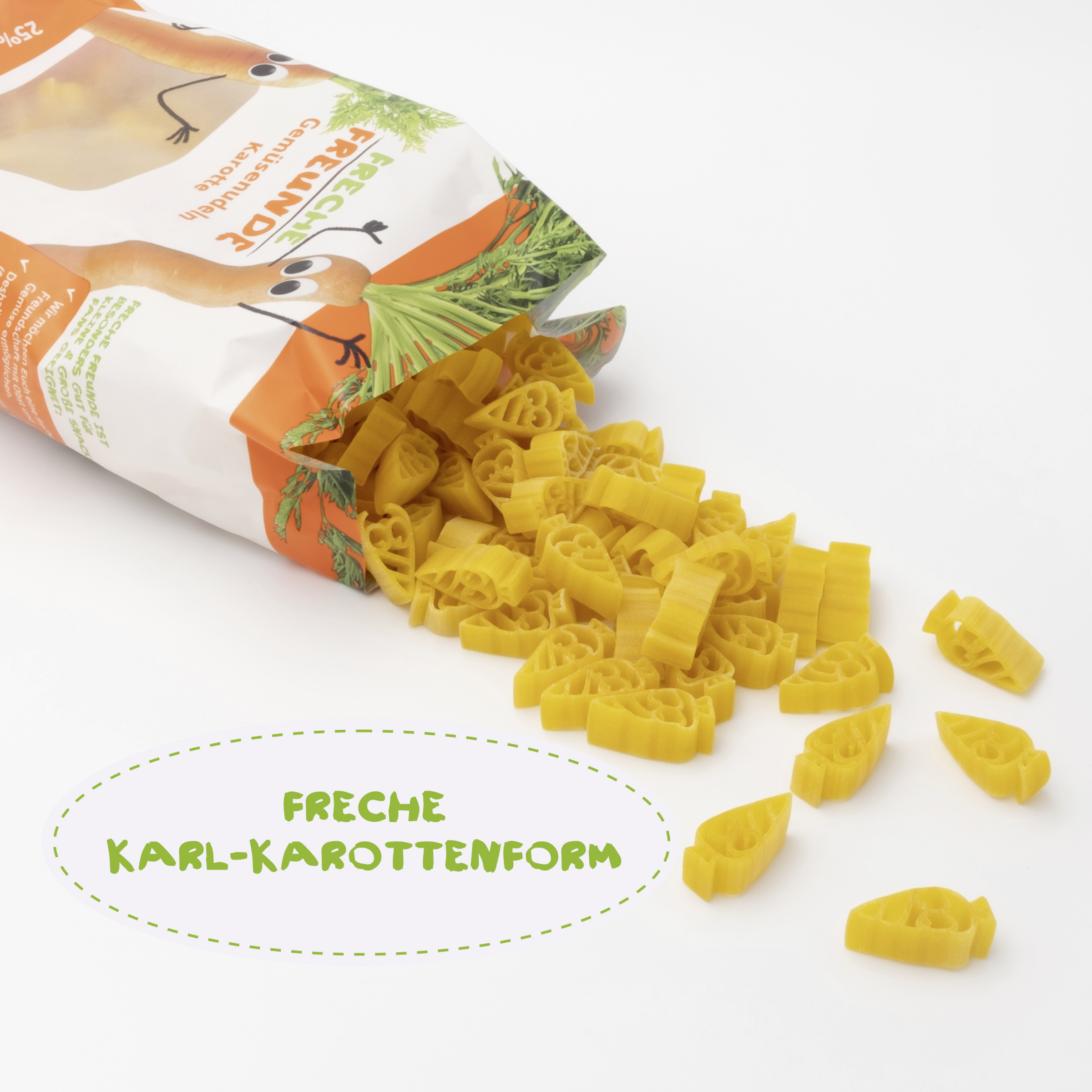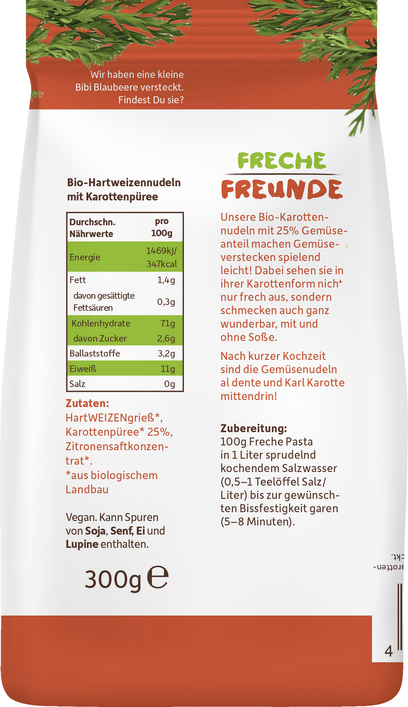 Die Bio-Karottennudeln für Kleinkinder mit 25% Gemüseanteil machen Gemüse-Verstecken spielend leicht! Dabei sehen sie in ihrer Karottenform nicht nur frech aus, sondern schmecken wunderbar, mit und ohne Soße. Nach kurzer Kochzeit sind die Gemüsenudeln al dente und Karl Karotte mittendrin! Natürlich ohne Zusatzstoffe! Der Teig aus Hartweizengrieß wird durch Bronzematrizen in Form gebracht und leicht aufgeraut, so dass die Soße besser daran haftet. Die Nudeln werden bei max. 35°C extra schonend getrocknet, damit möglichst viele Nährstoffe erhalten bleiben.