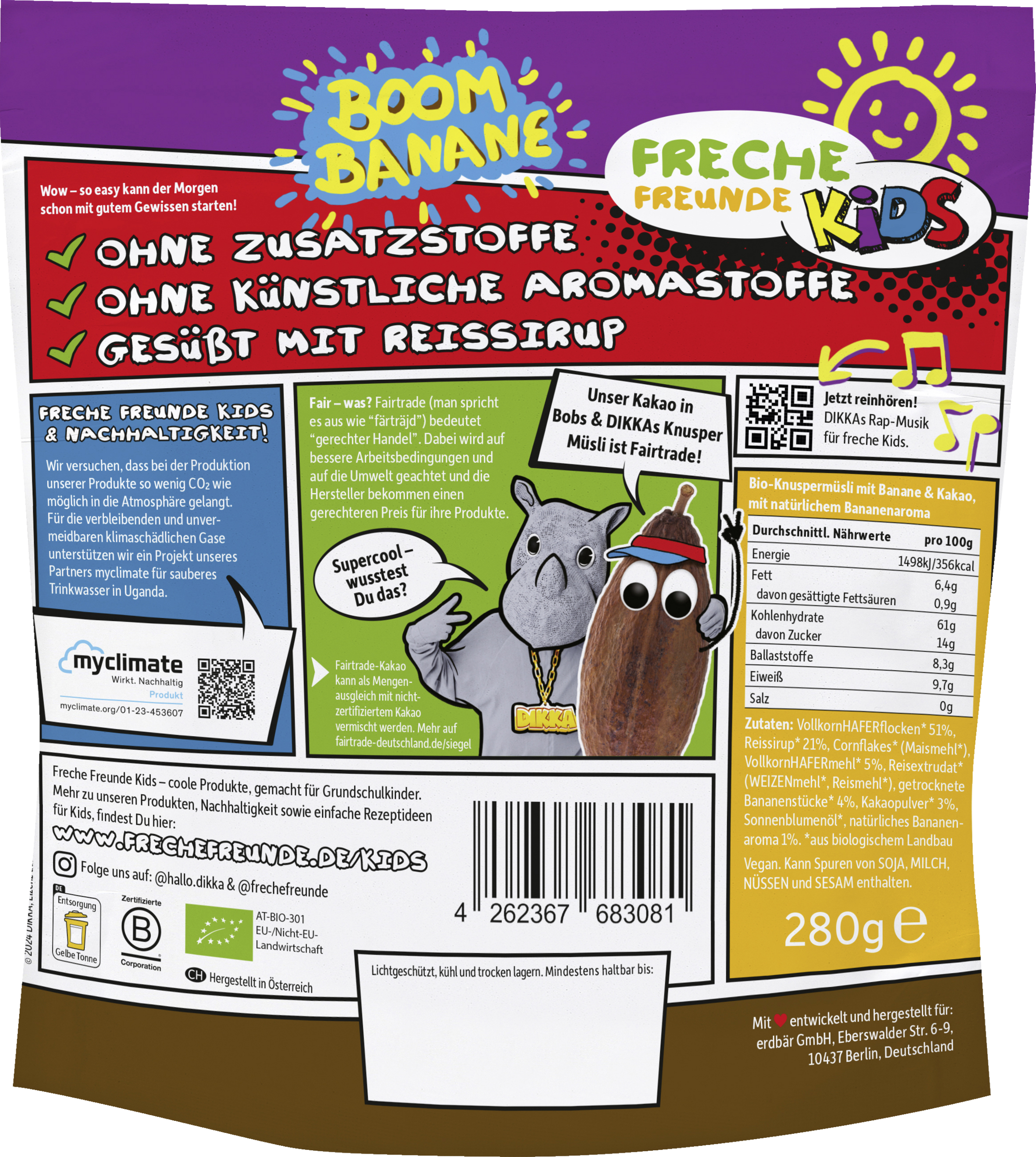 Bob Banane und das coole rappende Nashorn DIKKA sorgen für einen entspannten Start in den Tag mit dem Knusper Müsli mit Banane & Kakao! Mit einem Vollkorn-Volltreffer, fairem Kakao vom frechen Kumpel Kalle Kakaobohne und Müsli-Konfetti ist das Müsli crunchy und schmeckt! Perfekt als Frühstück vor der Schule oder als kleine Stärkung zwischen Hausi und frechen Abenteuern am Nachmittag. Es schmeckt super lecker ganz klassisch mit der Milch Deiner Wahl, aber auch als crunchy Topping auf Deinem Lieblingsjoghurt. Und was absolut cool ist am Schoko-Knusper-Müsli: das Knusper Müsli hat 30% weniger Zucker als vergleichbare Schoko-Knuspermüslis und mit dem Nutri-Score A, 100% Bio, vegan, ballaststoffreich und ohne Zusatzstoffe & künstliche Aromastoffe ist das fruchtig-freche Müsli wirklich für Schulkinder gemacht! Einfach das leckere Knusper Müsli Schoko Banane von Freche Freunde Kids kaufen und loscrunchen - für einen nashorn-starken Start in den Tag - oh yeah!