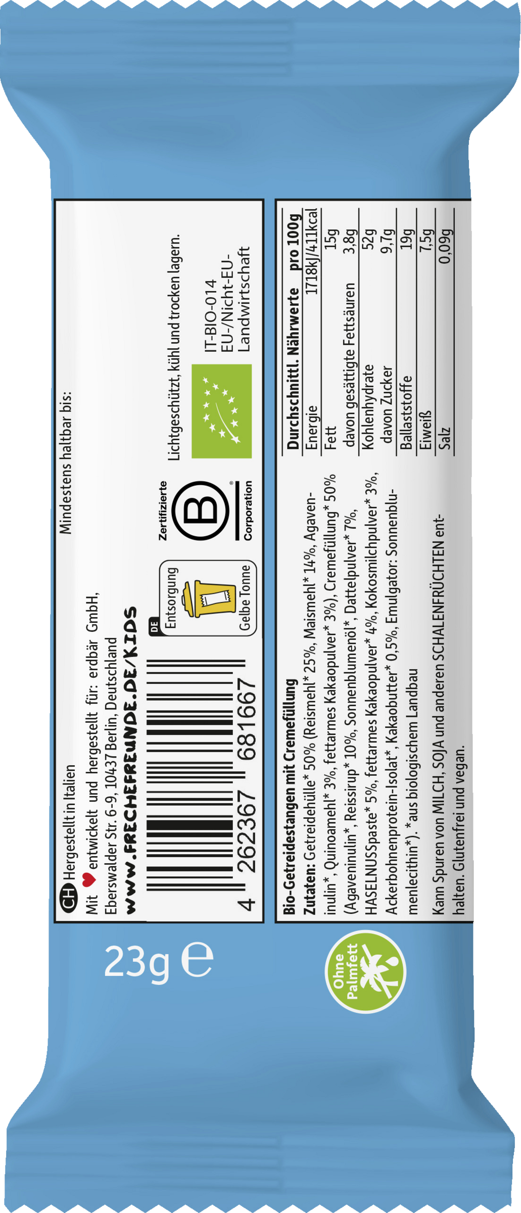Getreidehülle* 50%, (Reismehl* 25%, Maismehl* 14%, Agaveninulin*, Quinoamehl* 3%, fettarmes Kakaopulver* 3%), Cremefüllung* 50% (Agaveninulin*, Reissirup* 10%, Sonnenblumenöl*, Dattelpulver* 7%, HASELNUSSpaste* 5%, fettarmes Kakaopulver* 4%, Kokosmilchpulver* 3%, Ackerbohnenprotein-Isolat*, Kakaobutter* 0,5%, Emulgator: Sonnenblumenlecithin*).