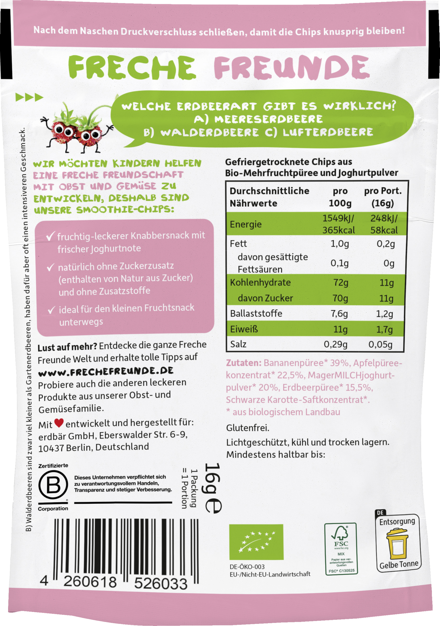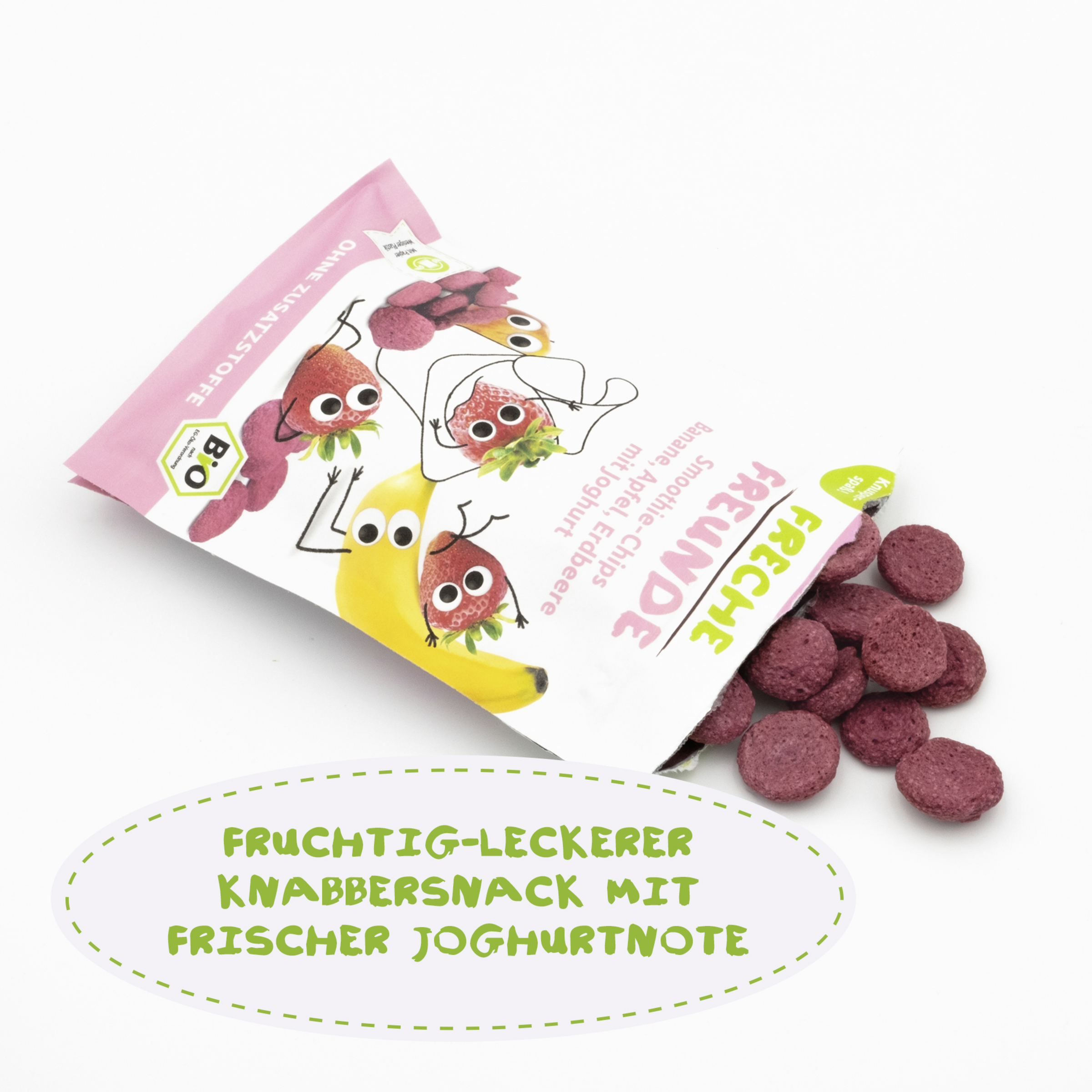 Knackig frech und ganz ohne Zuckerzusatz (Zutaten enthalten von Natur aus Zucker): die Freche Freunde Smoothie Chips mit Bob Banane, Alfred Apfel und Edda Erdbeere mit frischer Joghurt-Note sind da! Ein fruchtiger Kindersnack perfekt für unterwegs durch den wiederverschließbaren Beutel und ganz ohne Krümel oder schmierige Finger.