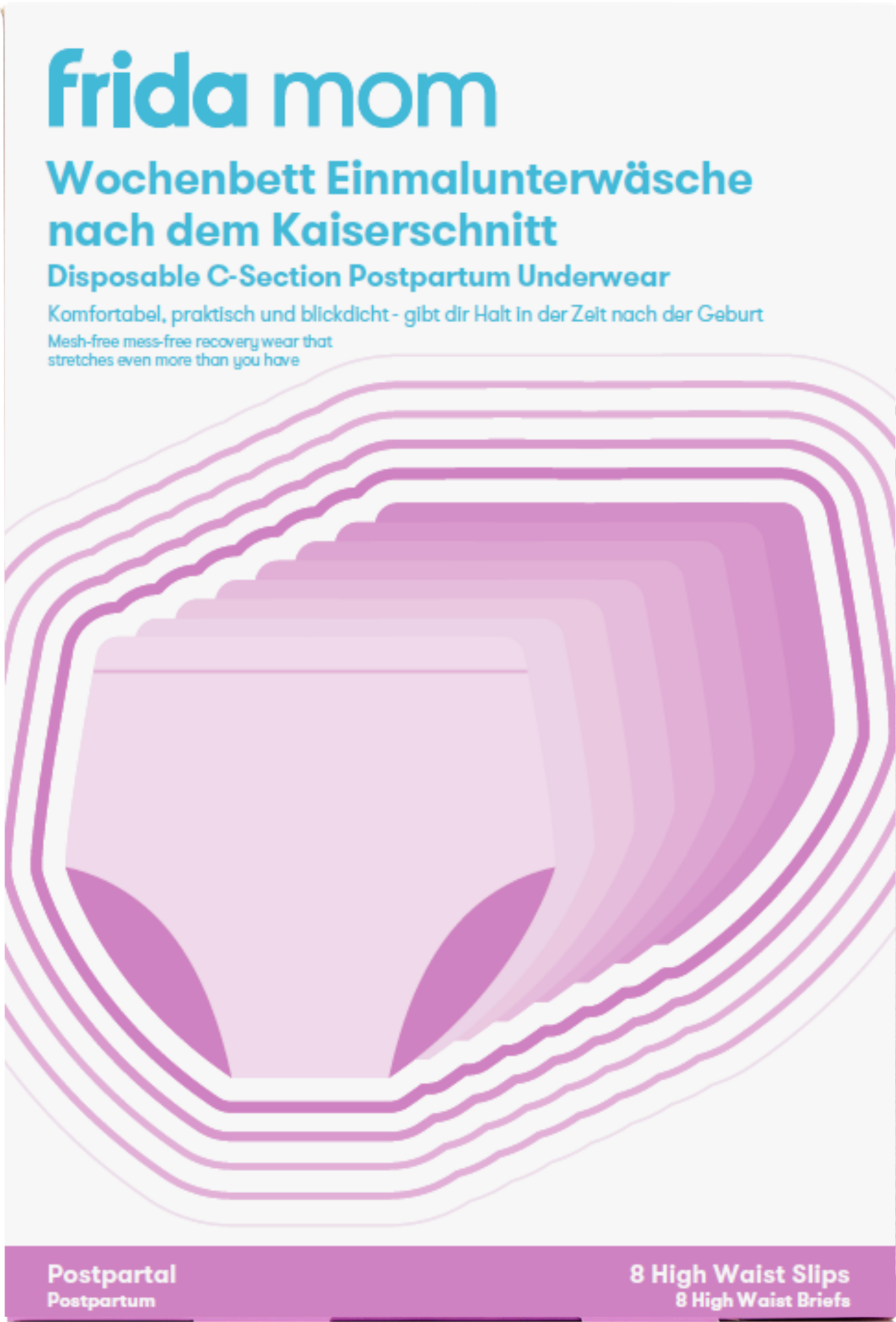 Pack die Unterwäsche in deine Geburtstasche für die Zeit im Krankenhaus und habe sie auch zu Hause in deinem Badezimmer stets griffbereit. Die Frida Einmalunterwäsche nach dem Kaiserschnitt ist Schritt 2 des Frida Mom 5-Schritte-Programms.