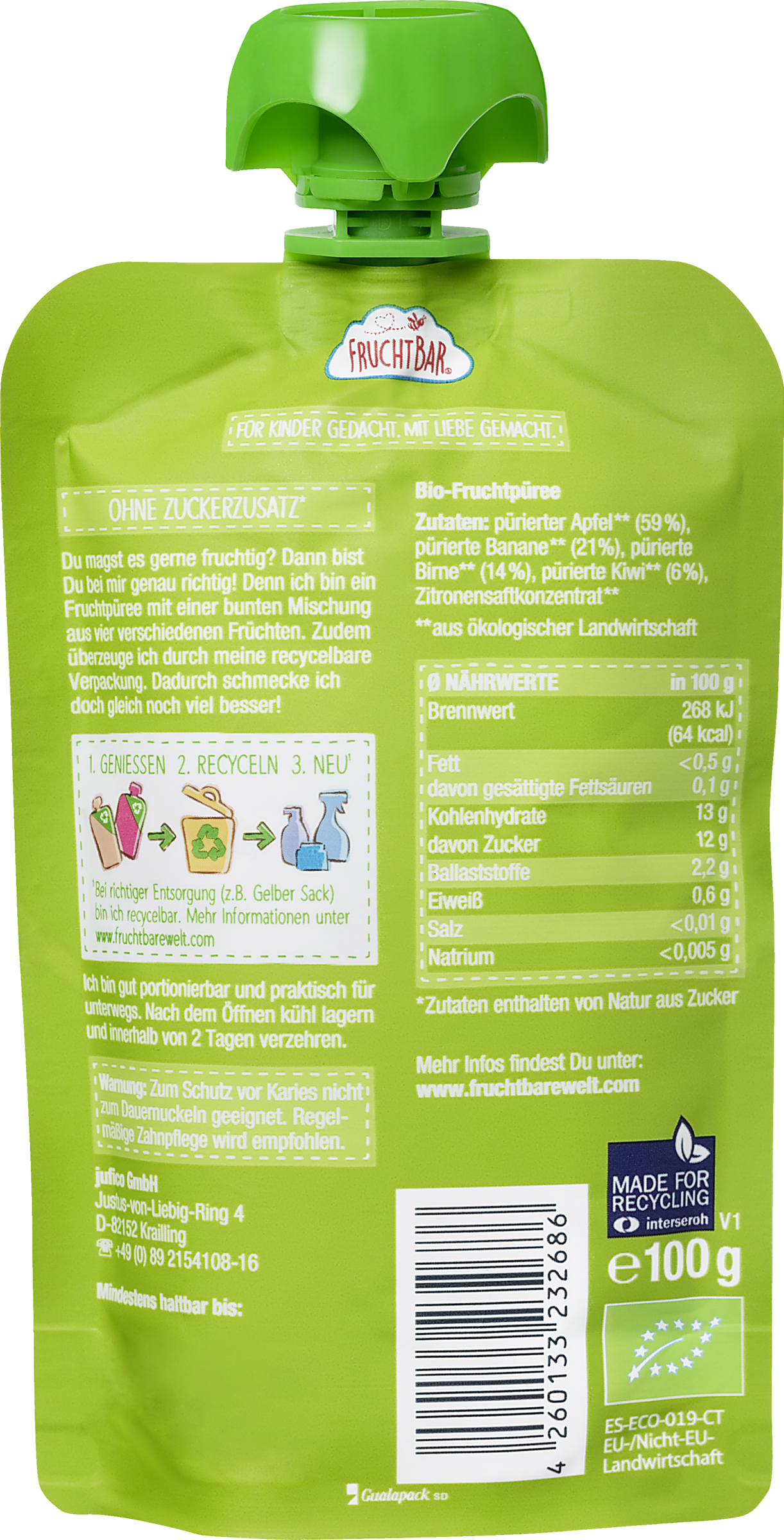 pürierter Apfel* (59%), pürierte Banane* (21%), pürierte Birne* (14%), pürierte Kiwi* (6%), Zitronensaftkonzentrat*