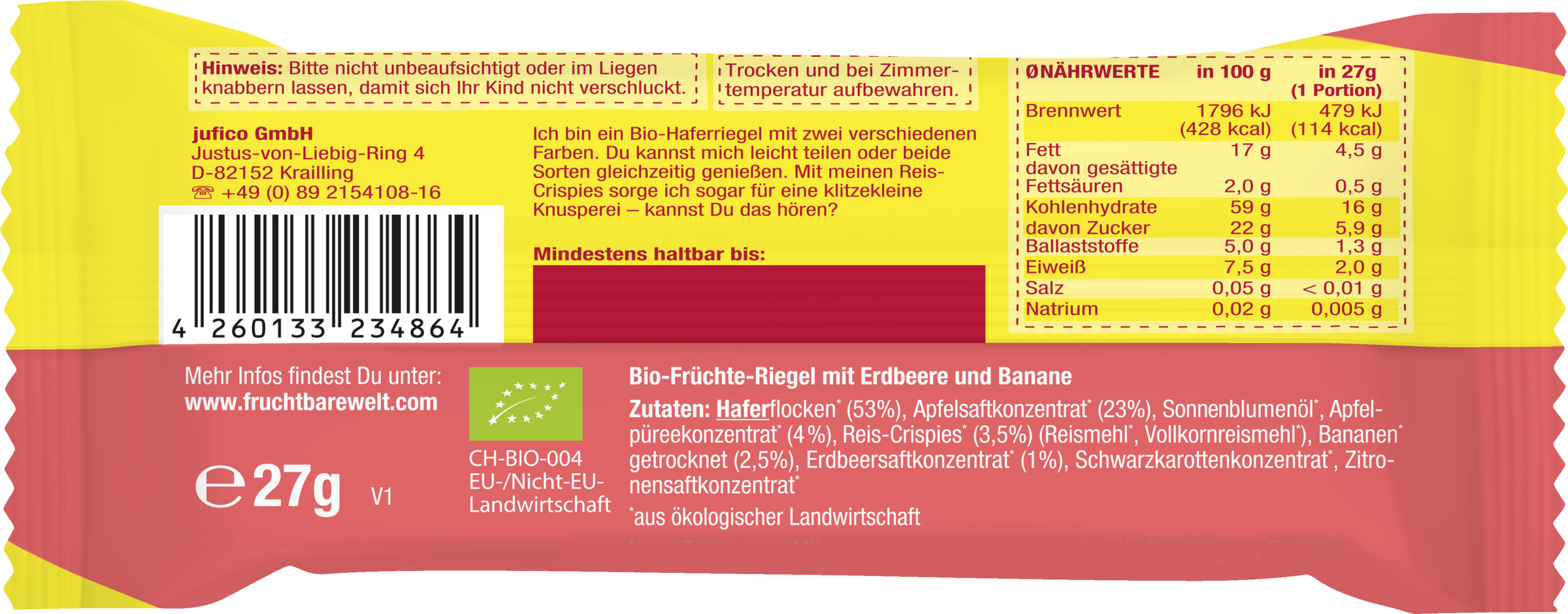 HAFERflocken* (53%), Apfelsaftkonzentrat* (23%), Sonnenblumenöl*, Apfelpüreekonzentrat* (4%), Reis-Crispies* (3,5%) (Reismehl*, Vollkornreismehl*), Bananen* getrocknet (2,5%), Erdbeersaftkonzentrat* (1%), Schwarzkarottenkonzentrat, Zitronensaftkonzentrat*.