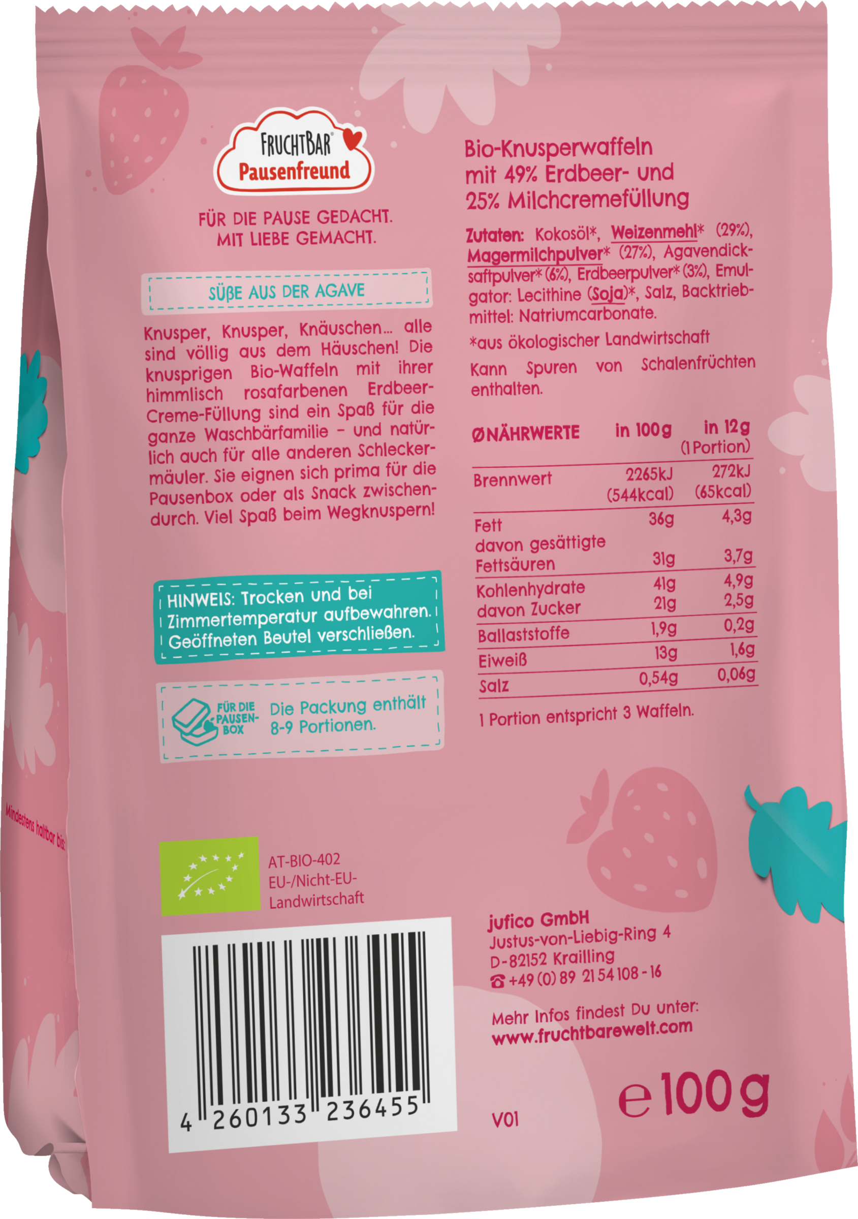 Knusper, Knusper, Knäuschen... alle sind völlig aus dem Häuschen! Die knusprigen Bio-Waffeln mit ihrer himmlisch rosafarbenen Erdbeer-Creme-Füllung sind ein Spaß für die ganze Waschbärfamilie - und natürlich auch für alle anderen Schleckermäuler. Sie eignen sich prima für die Pausenbox oder als Snack zwischendurch. Viel Spaß beim Wegknuspern!