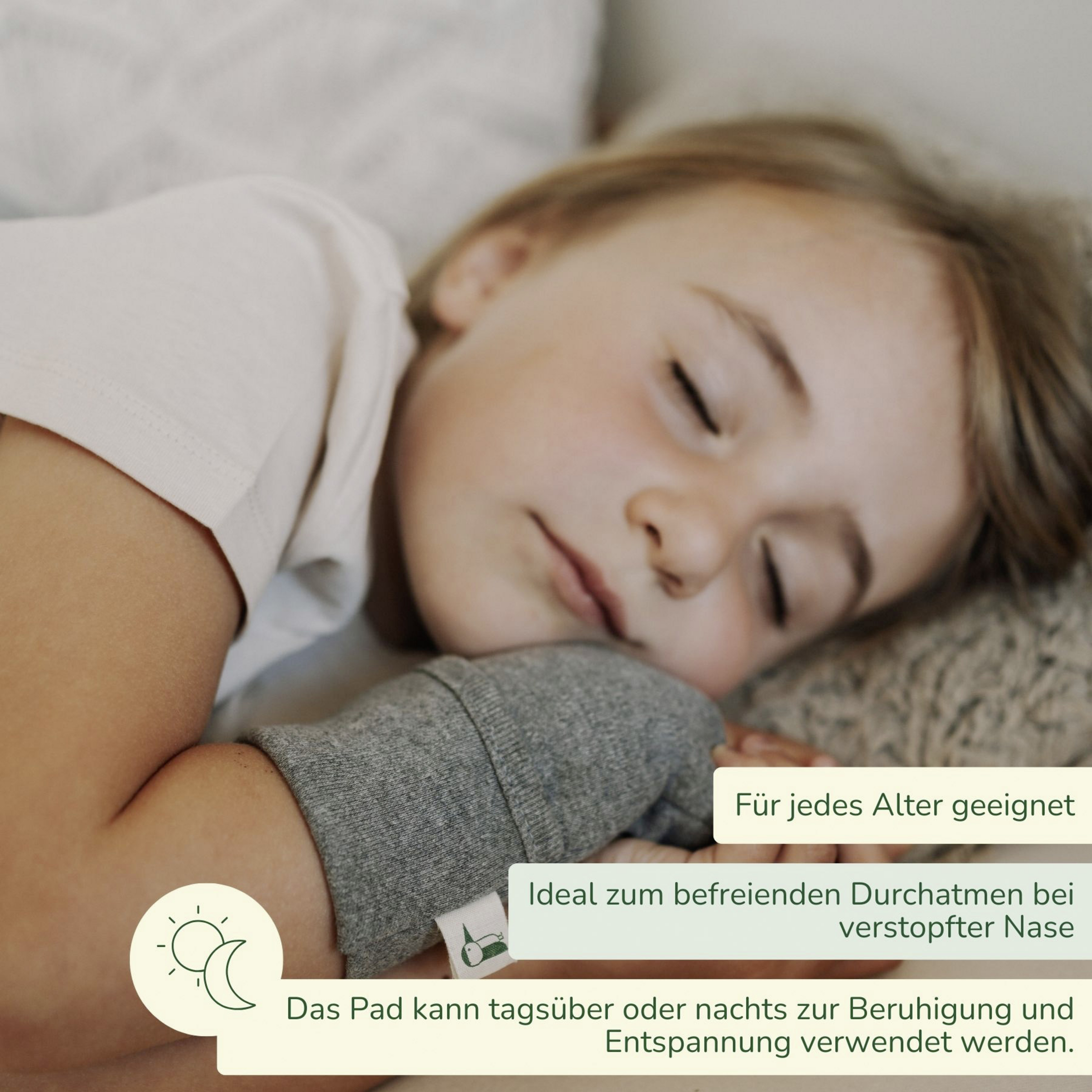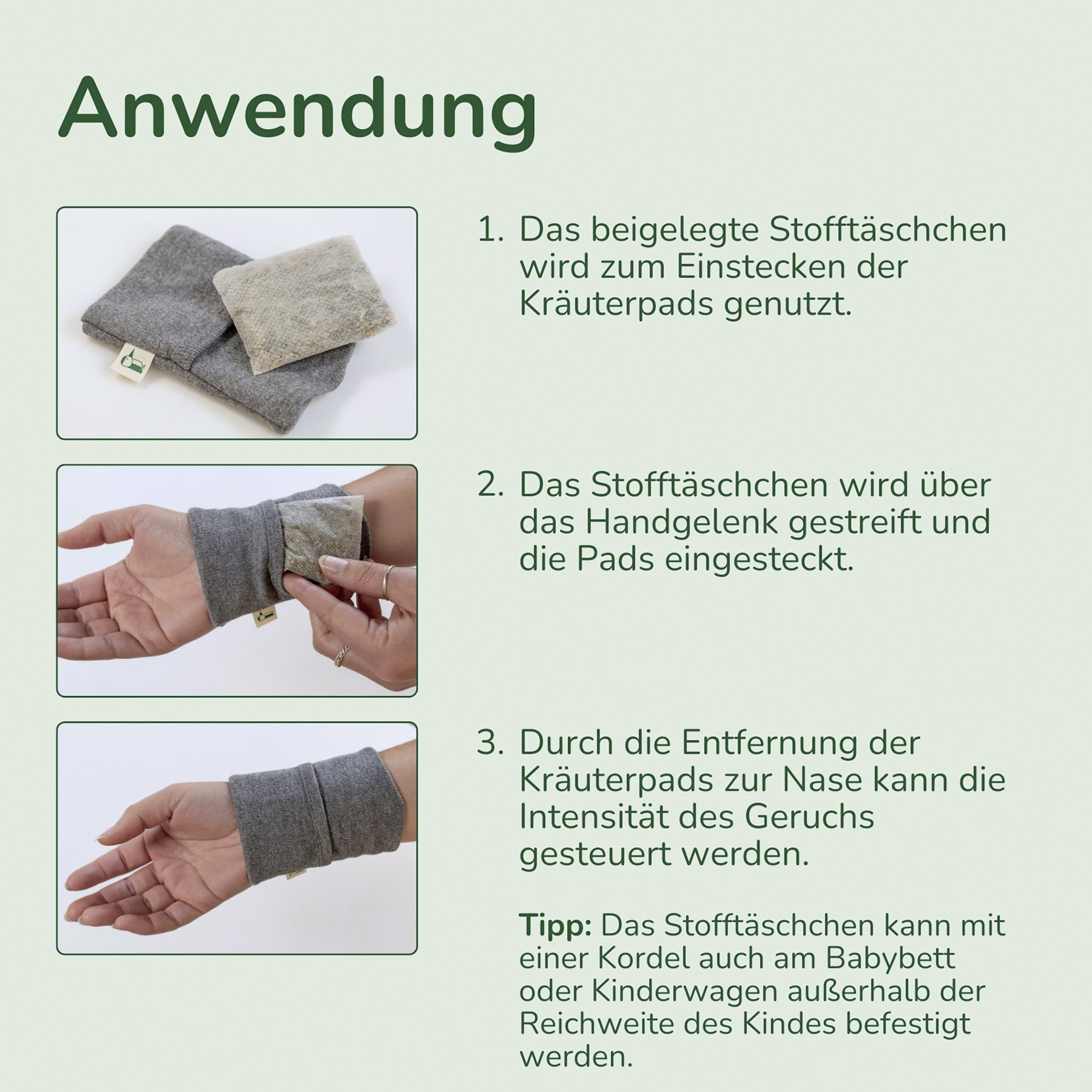 Durch die Entfernung des Kräuterpads zur Nase kann die Intensität des Geruchs gesteuert werden. Ist die Art der Anwendung zu intensiv, dann kann das Kräuterpad weiter weg, z.B. neben dem Bett oder unter dem Bettbezug, platziert werden. Durch gelegentliches Kneten kann der Geruch des Kräuterpads wieder verstärkt werden. Nach 2-3 Wochen sollte das Kräuterpad durch ein neues ersetzt werden. Bei größeren Kindern und Erwachsenen kann das Kräuterpad in das Stofftäschchen (Ø ca. 7 cm) gesteckt und bequem über das Handgelenk gestreift werden. Bei Kindern unter 3 Jahren kann das Kräuterpad in dem Stofftäschchen mit einem Klettverschluss oder einer Schnur außer Reichweite des Kindes, z.B. am Bett oder an einem Mobile, befestigt werden. Die Stofftasche kann bei Bedarf gemäß den Angaben auf dem Einnäher gewaschen werden.