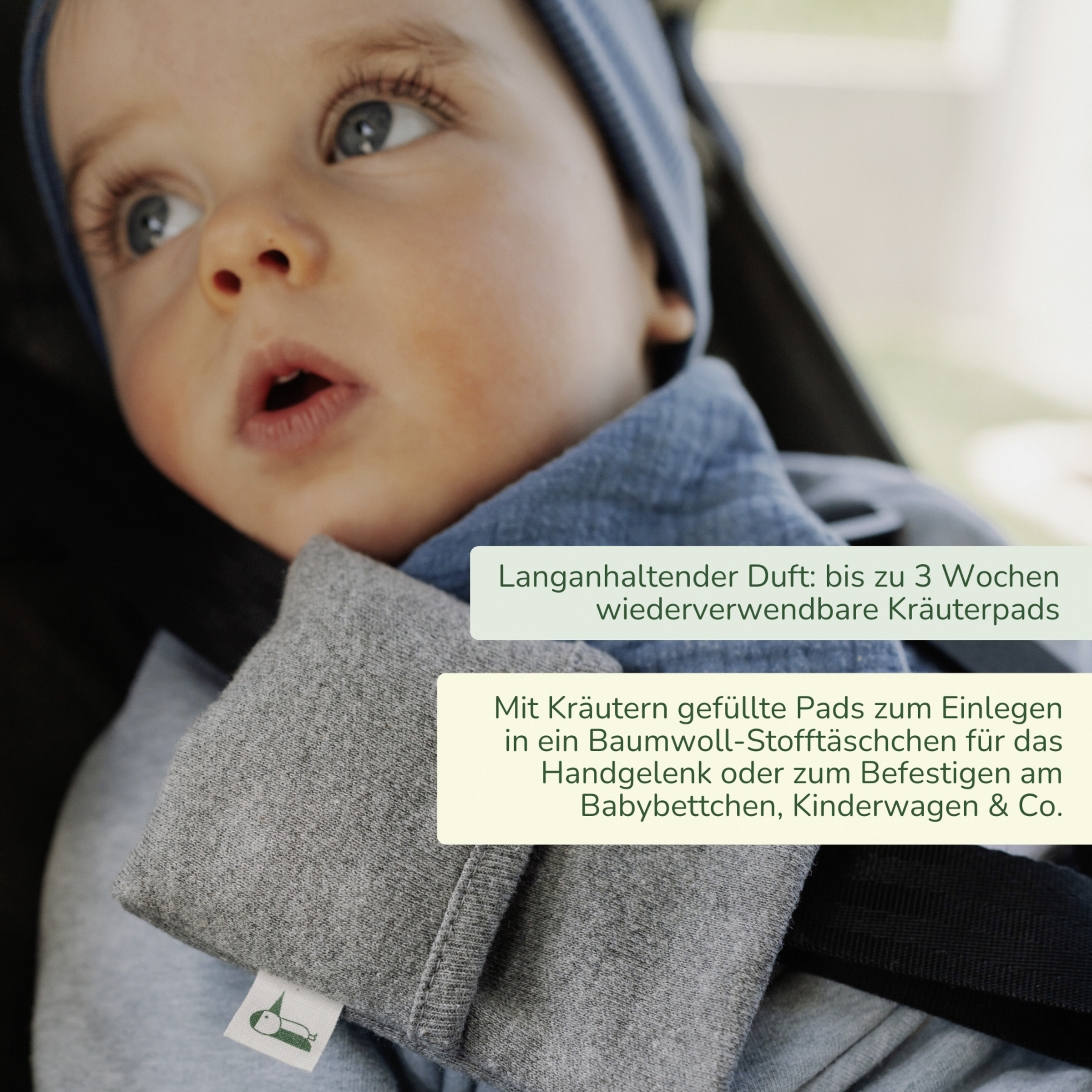 Für die Sicherheit Ihres Kindes ACHTUNG! Verwenden Sie bei Kindern unter 3 Jahren immer die Stofftasche für das Kräuterpad (Starter-Set). Lassen Sie Ihr Kind nicht unbeaufsichtigt. Es besteht Verschluckungs- und Erstickungsgefahr. Unsere Kräutermischungen haben wir gezielt auch im Hinblick auf Allergiepotential ausgewählt. Sollten sich bei Ihnen trotzdem allergische Reaktionen zeigen, bitte die Anwendung sofort abbrechen. Die Kräuterpads sind kein Lebensmittel.