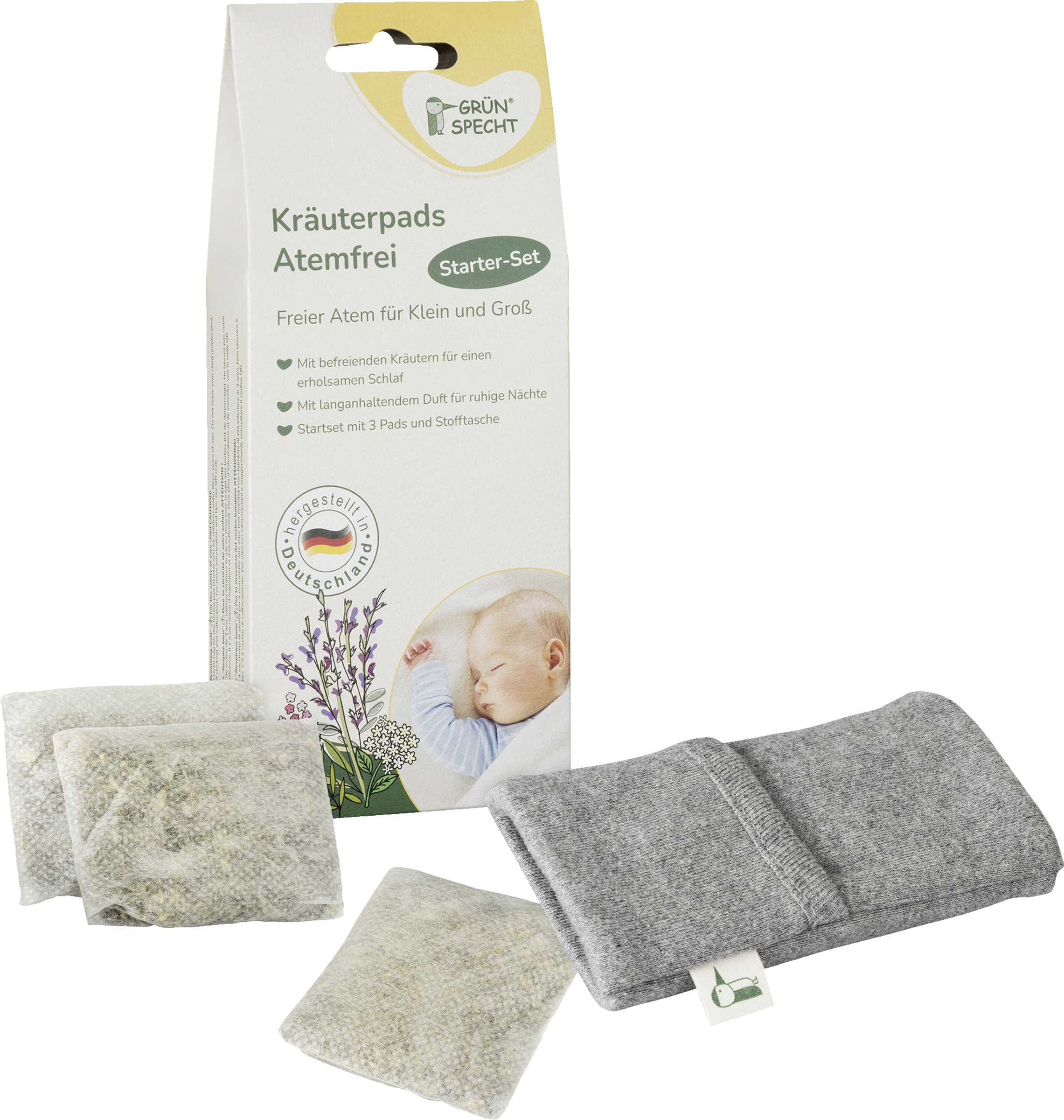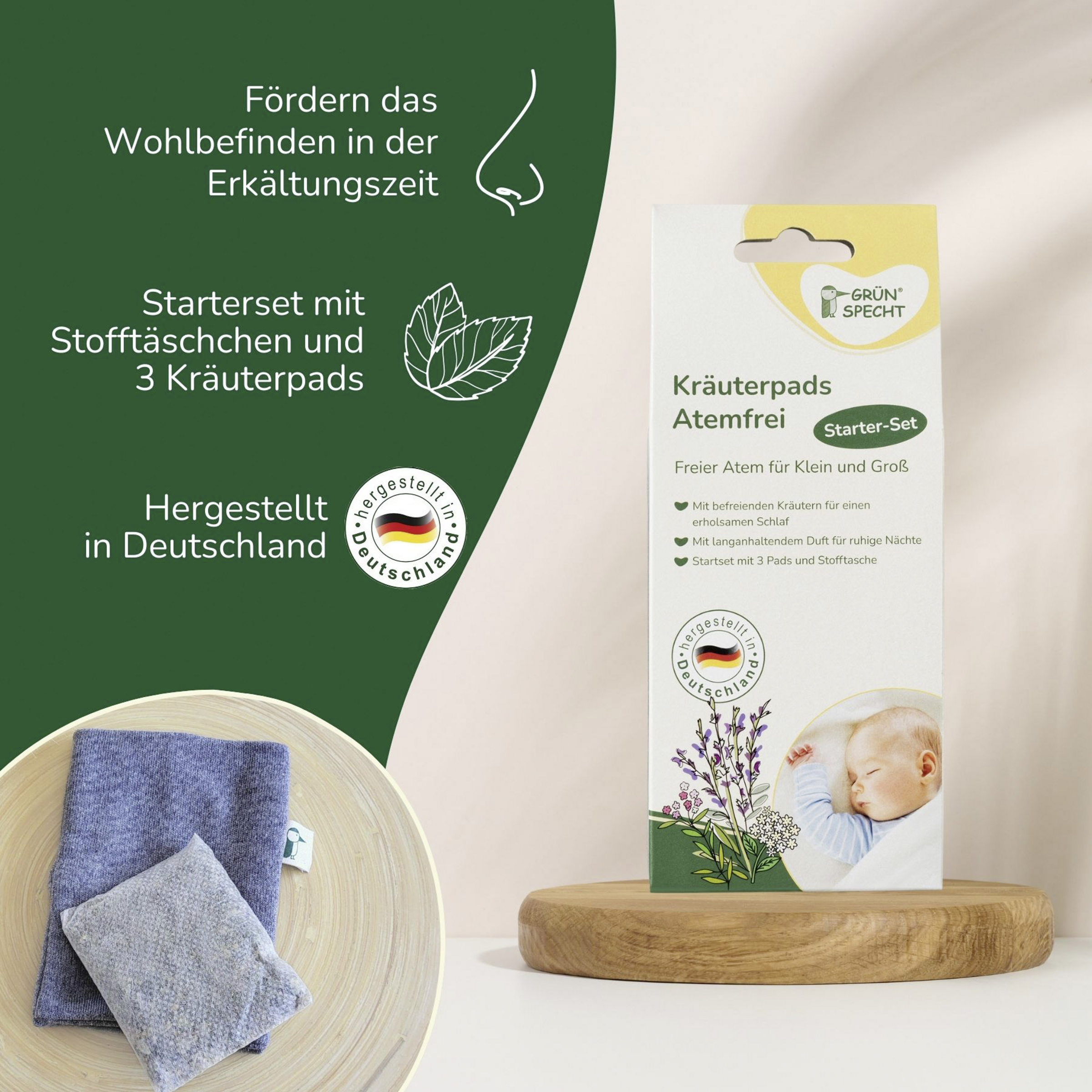 Die Kräuterpads „Atemfrei“ von Grünspecht wirken beruhigend und fördern das Wohlbefinden in der Erkältungszeit bei Klein und Groß. Das Starter-Set enthält drei, für jeweils bis zu 3 Wochen wiederverwendbare, Duftpads mit sorgfältig zusammengestellten Kräutern (u.a. Salbei, Zitronenverbene, Holunder), deren wohltuender Duft bei einer verstopften Nase unterstützt. Die Pads können bequem in das Stofftäschchen aus 100 % Baumwolle gesteckt werden. Bei Babys und Kleinkindern kann dieses z.B. am Bettchen oder Kinderwagen befestigt werden. Kinder und Erwachsene können es am Handgelenk tragen. Hergestellt werden die Kräuterpads mit hochwertigen Kräutern in Lebensmittelqualität in Deutschland. Es wurde sich dabei bewusst für größere Pflanzenteile in den Pads entschieden. Wenn der Duft mit der Zeit nachlässt, können die Kräuter durch Kneten aufgebrochen werden und der Duft wird wieder verstärkt.