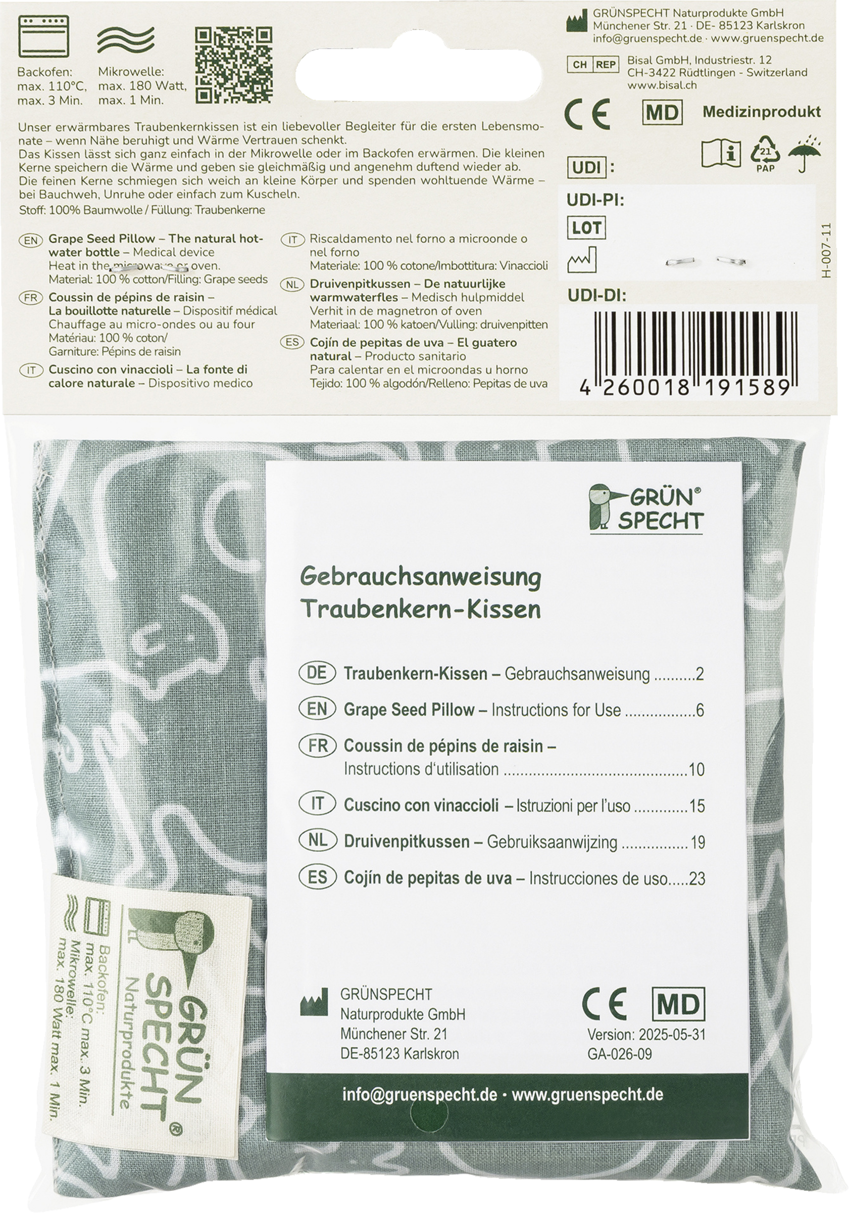 Halten Sie sich unbedingt an die angegebenen Erwärmungshinweise, da längere Zeiten oder höhere Energieleistungen zu Schäden führen können (Entflammungs- und Verbrennungsgefahr!). Prüfen Sie vor einer Erwärmung des Kissens in der Mikrowelle, dass eine Erhitzung von Körnerprodukten in der Gebrauchsanweisung des Herstellers erlaubt ist. Nach dem Erwärmen die Temperatur des Kissens auf Eignung für Babys (max. 43 °C) an Ihrer Armbeuge prüfen! Kissen von einer erwachsenen Person, nur unter Aufsicht und nicht feucht erwärmen! Kissen vor dem nächsten Erwärmen abkühlen lassen! Das Produkt sollte keinesfalls als Kopfkissen oder Sitzgelegenheit verwendet werden. Bitte suchen Sie bei anhaltenden oder sich verschlechternden Symptomen einen Arzt auf. Verwenden Sie das Kissen nicht bei akuten und chronischen, entzündlichen oder fieberhaften Erkrankungen, Kreislaufbeschwerden, frischen Hämatomen, Blutergüssen und offenen Wunden sowie bei Personen mit verringertem Schmerzempfinden. Bei bestehenden Haut-, Herz-, Venen, Diabetes- oder Tumorerkrankungen sowie einer Schwangerschaft bitte vor der Anwendung an einen Arzt wenden. Achten Sie auf unversehrte Nähte! Bei losen Traubenkernen besteht Verschluckungs- und Erstickungsgefahr! Benutzung nur unter unmittelbarer Aufsicht von Erwachsenen! Sollten sich Nähte geöffnet haben und lose Kerne austreten, entsorgen Sie das Produkt und die losen Kerne sofort und unzugänglich für Kinder. Wird das Produkt bei Babys unter 1 Jahr angewendet, sollte die Temperatur des Kindes während der Anwendung regelmäßig kontrolliert werden, um Überhitzung auszuschließen! Alle im Zusammenhang mit dem Produkt aufgetretenen schwerwiegenden Vorfälle sind dem Hersteller und der zuständigen Behörde des Landes, in dem der Anwender niedergelassen ist, zu melden.