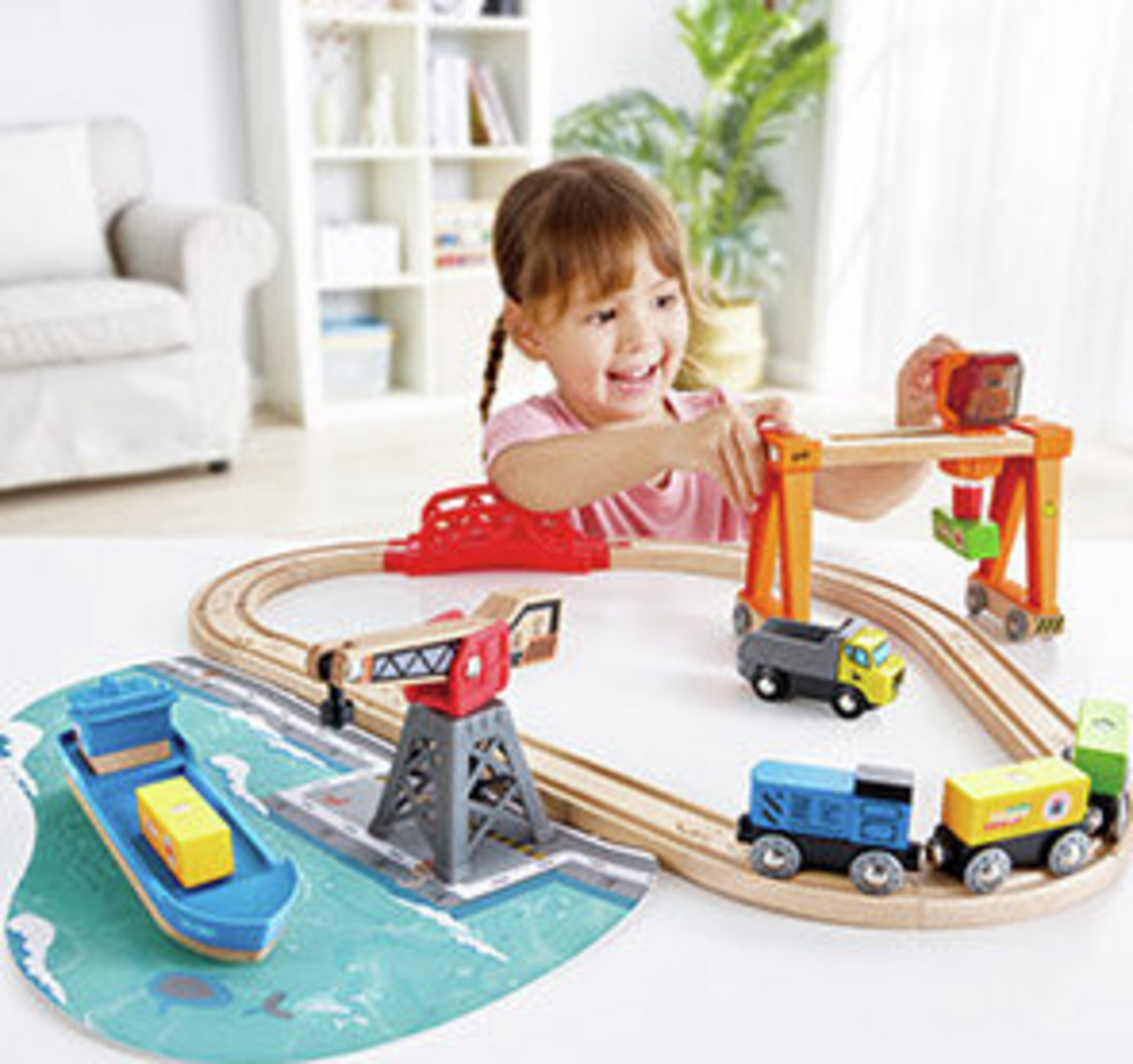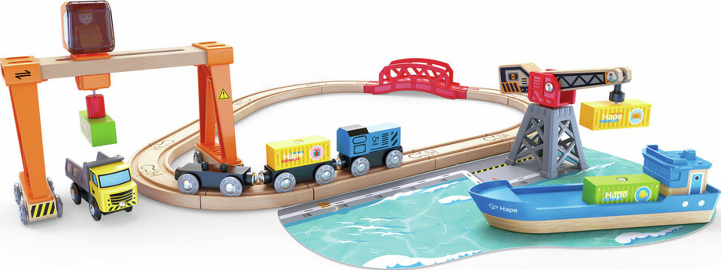 Es ist an der Zeit, die über das Meer transportierte Fracht zu entladen. Mit diesem Spielset können Kinder die aufregende Atmosphäre eines geschäftigen Hafenbereichs erleben. Der bewegliche Kran ermöglicht es, sperrige Güter vom Schiff auf den Zug und umgekehrt zu verladen. Die Container können sogar gestapelt werden, damit das Schiff voll beladen weiterfahren kann. Ein fantastisches Hafenset für Kinder, um etwas über Schiffs- und Bahntransport zu erfahren.