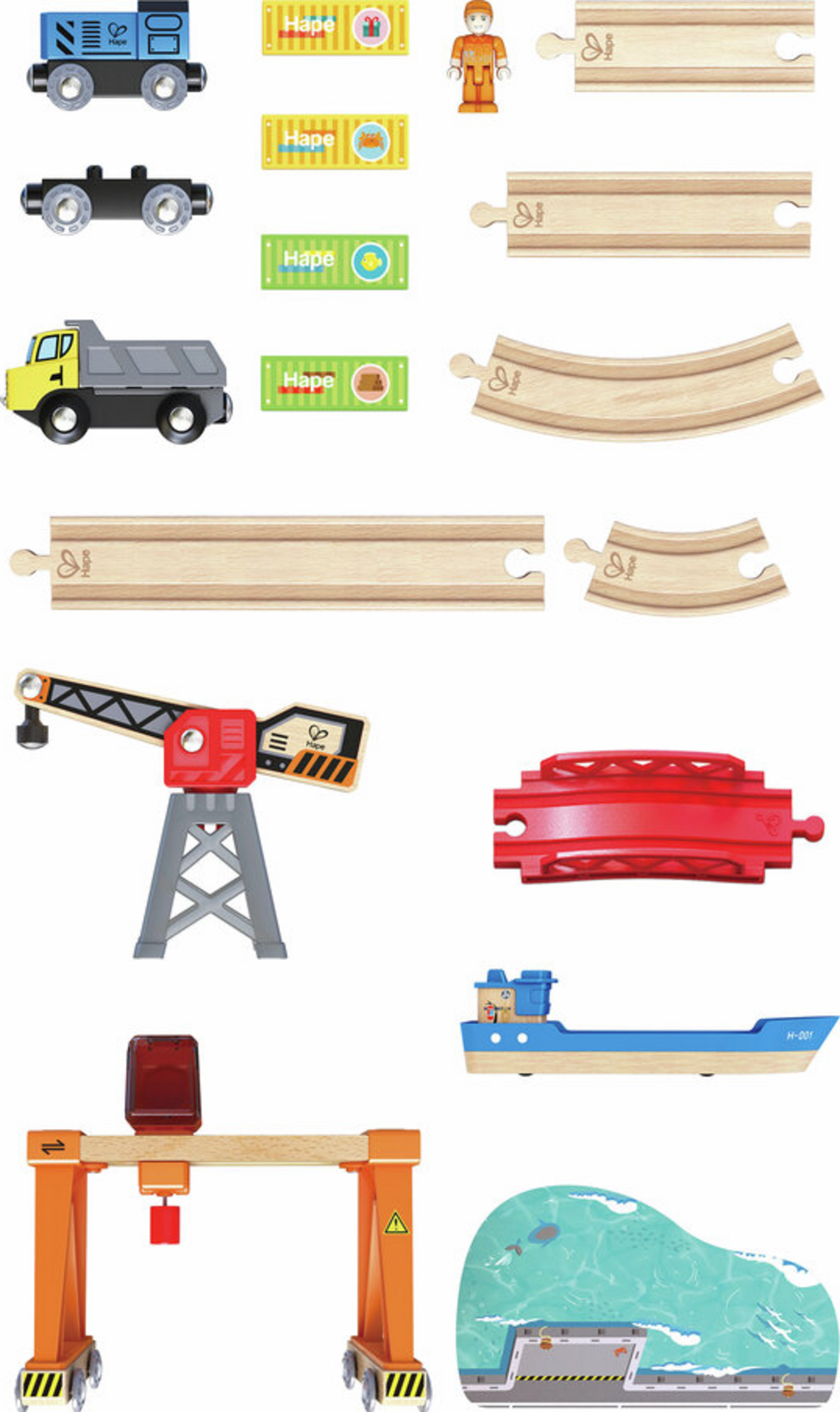 Enthält einen Hafenkran, einen Ladekran, sechs kleine gebogene Gleise, zwei große gebogene Gleise, ein gerades Gleis (15 cm), ein gerades Gleis (10 cm), ein gerades Gleis (20 cm), ein Frachtschiff, eine Lokomotive, zwei Anhänger, einen Lastwagen, vier Frachtblöcke, eine Figur, eine Brücke und eine kleine Spielmatte aus Pappe mit einem maritimen Thema. Sensibilisierung der Kinder für die biologische Vielfalt und die globale Erwärmung.