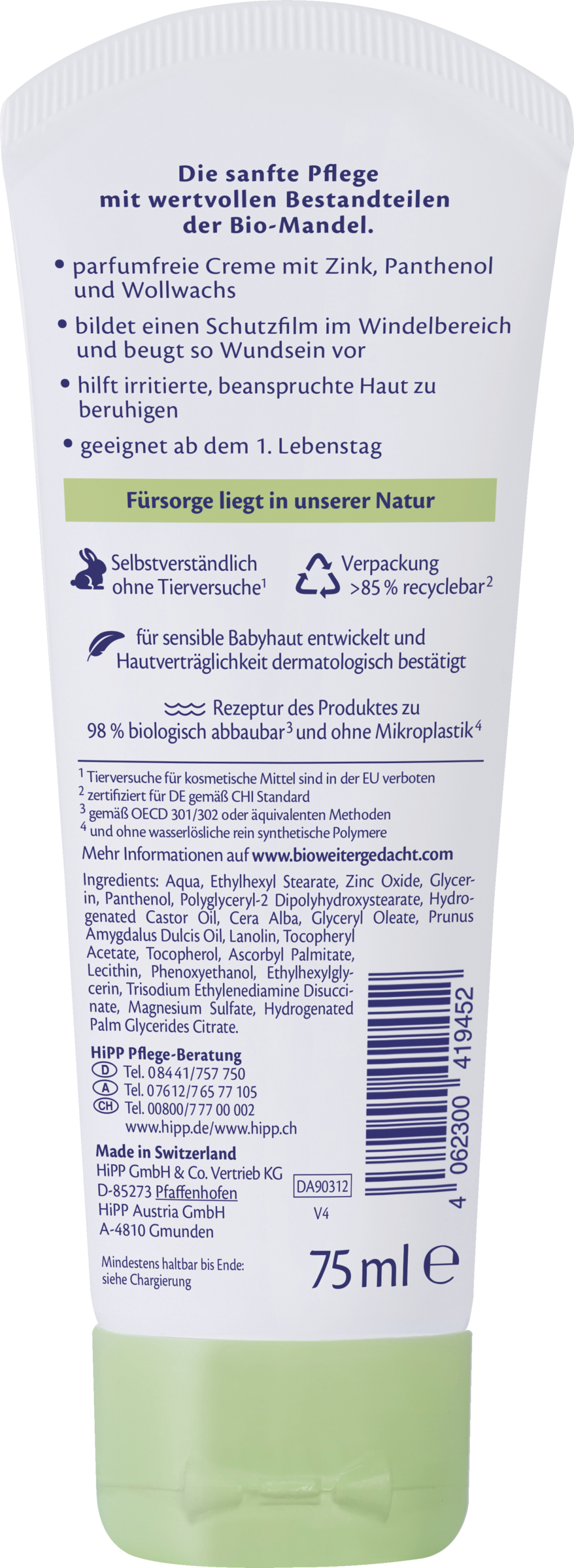 HiPP Babysanft - jetzt sanfter und nachhaltiger denn je. Die parfumfreie Wundschutzcreme mit Bio-Mandelöl, Zink, Panthenol und natürlichem Wollwachs reduziert leichte Rötungen und beruhigt irrtitierte Haut - ab dem 1. Lebenstag. Bildet einen Schutzfilm im Windelbereich und beugt so Wundsein vor. Kann bei jedem Windelwechsel dünn aufgetragen werden. 0% Mikroplastik, Parabene und Mineralöl. Rezeptur biologisch abbaubar, Verpackung recylebar und klimapositiv.