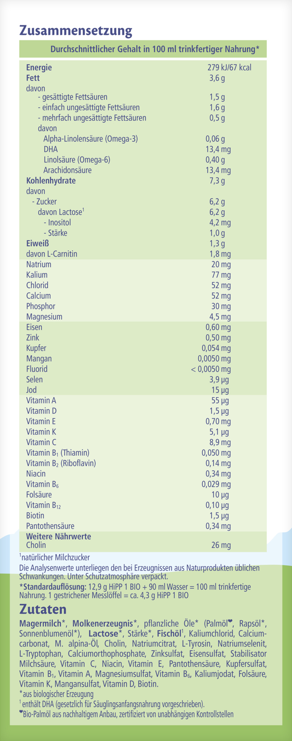 MAGERMILCH*, MOLKENERZEUGNIS*, pflanzliche Öle* (Palmöl**, Rapsöl*, Sonnenblumenöl*), LACTOSE*, Stärke*, FISCHÖL (1), Kaliumchlorid, Calciumcarbonat, M. alpina-Öl, Cholin, Natriumcitrat, L-Tyrosin, Natriumselenit, L-Tryptophan, Calciumorthophosphate, Zinksulfat, Eisensulfat, Stabilisator Milchsäure, Vitamin C, Niacin, Vitamin E, Pantothensäure, Kupfersulfat, Vitamin B1, Vitamin A, Magnesiumsulfat, Vitamin B6, Kaliumjodat, Folsäure, Vitamin K, Mangansulfat, Vitamin D, Biotin.