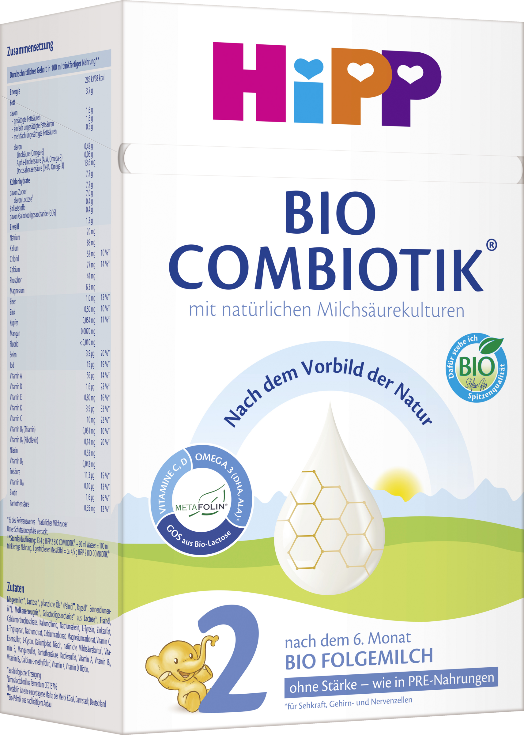 Wichtige Hinweise… für die Ernährung Ihres Babys Ausschließliches Stillen in den ersten sechs Monaten ist ideal für Ihr Baby. Wie jede Folgenahrung sollte HiPP 2 BIO COMBIOTIK® ohne Stärke nicht in den ersten sechs Monaten als Muttermilchersatz verwendet werden, sondern grundsätzlich erst nach sechs Monaten als Bestandteil einer gemischten Ernährung. Die individuellen Wachstums- und Entwicklungsbedürfnisse Ihres Babys können es erforderlich machen, Folgenahrungen als Teil einer gemischten Ernährung bereits zu einem früheren Zeitpunkt in den Speiseplan Ihres Babys einzuführen. Bitte lassen Sie sich von Ihrem Kinderarzt beraten. Achten Sie auf eine ausgewogene Ernährung und eine gesunde Lebensweise. Wichtige Hinweise… für die Zahngesundheit Ihres Babys Wie Muttermilch enthalten auch alle Säuglingsmilchnahrungen Kohlenhydrate. Sie sind ein wichtiger Bestandteil der Ernährung Ihres Babys. Häufiger oder andauernder Kontakt der Zähne mit kohlenhydrathaltigen Flüssigkeiten kann zu Karies und damit zu Gesundheitsbeeinträchtigungen führen. Überlassen Sie Ihrem Kind die Flasche nicht zum Dauernuckeln und lassen Sie es so früh wie möglich aus der Tasse trinken. Unter Schutzatmosphäre verpackt.
