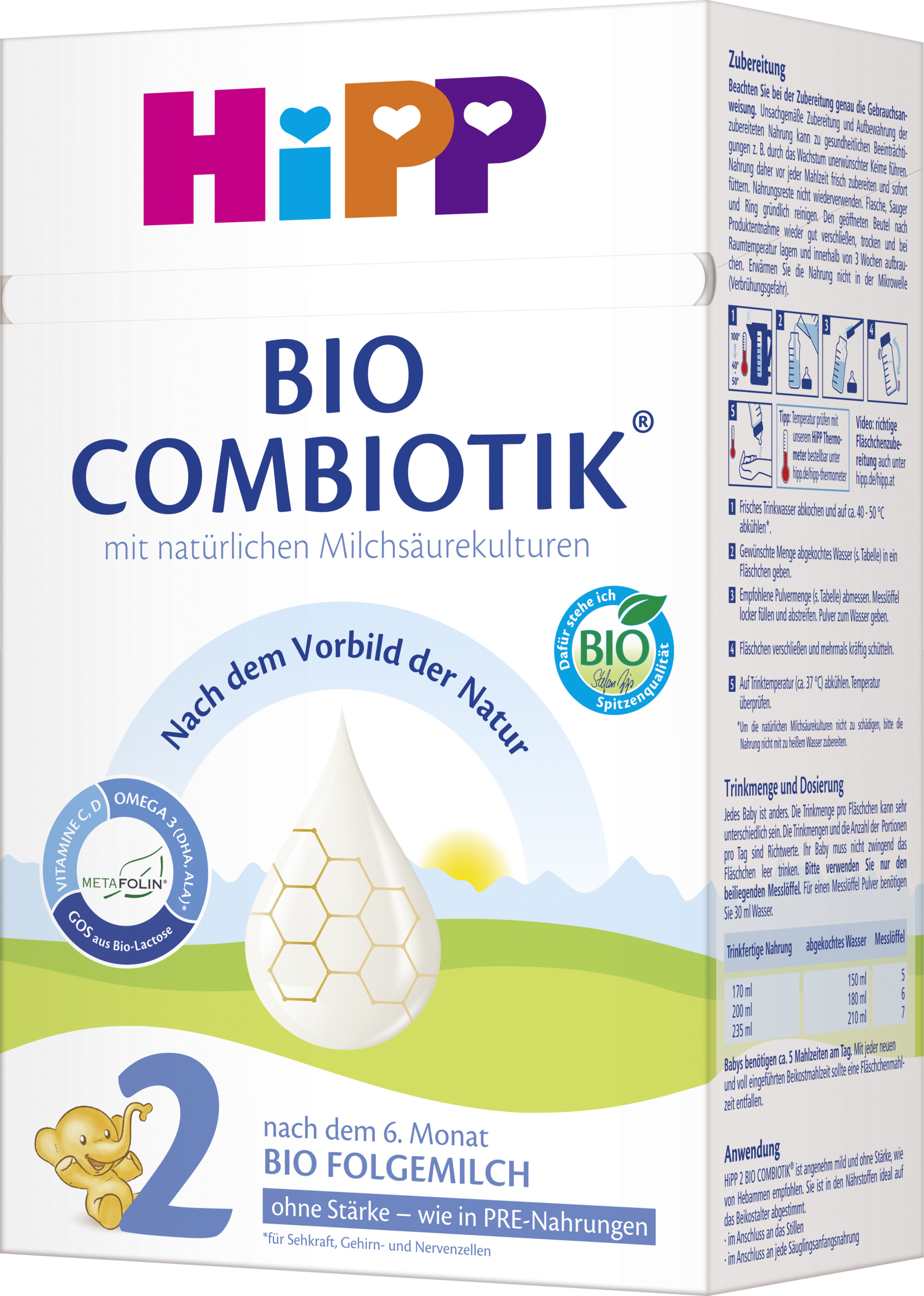 HiPP 2 BIO COMBIOTIK® ist angenehm mild und ohne Stärke, wie von Hebammen empfohlen. Sie ist in den Nährstoffen ideal auf das Beikostalter abgestimmt. Im Anschluss an das Stillen, wenn Ihr Baby bereits Gläschen bekommt. Im Anschluss an jede Pre-Nahrung als Milchnahrung für das Beikostalter. Bitte überzeugen Sie sich vor Verwendung, dass die Faltschachtel unversehrt geblieben ist.