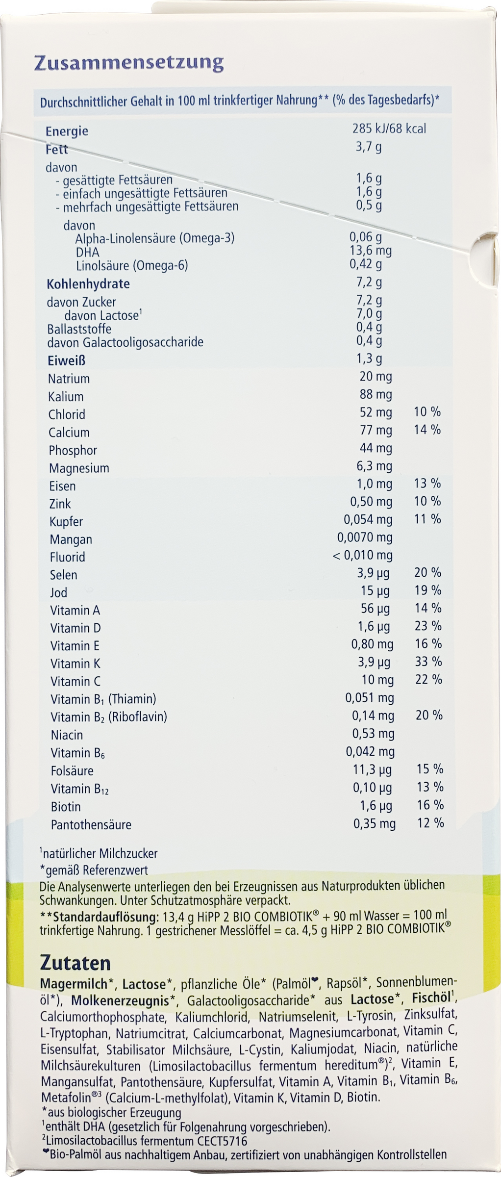MAGERMILCH*, LACTOSE*, pflanzliche Öle* (Palmöl** , Rapsöl*, Sonnenblumenöl*), MOLKENERZEUGNIS*, Galactooligosaccharide* aus LACTOSE*, FISCHÖL¹, Calciumorthophosphate, Kaliumchlorid, Natriumselenit, L-Tyrosin, Zinksulfat, L-Tryptophan, Natriumcitrat, Calciumcarbonat, Magnesiumcarbonat, Vitamin C, Eisensulfat, Stabilisator Milchsäure, L-Cystin, Kaliumjodat, Niacin, natürliche Milchsäurekulturen (Limosilactobacillus fermentum hereditum®)², Vitamin E, Mangansulfat, Pantothensäure, Kupfersulfat, Vitamin A, Vitamin B1, Vitamin B6, Metafolin®³ (Calcium-L-methylfolat), Vitamin K, Vitamin D, Biotin.*aus biologischer Erzeugung.