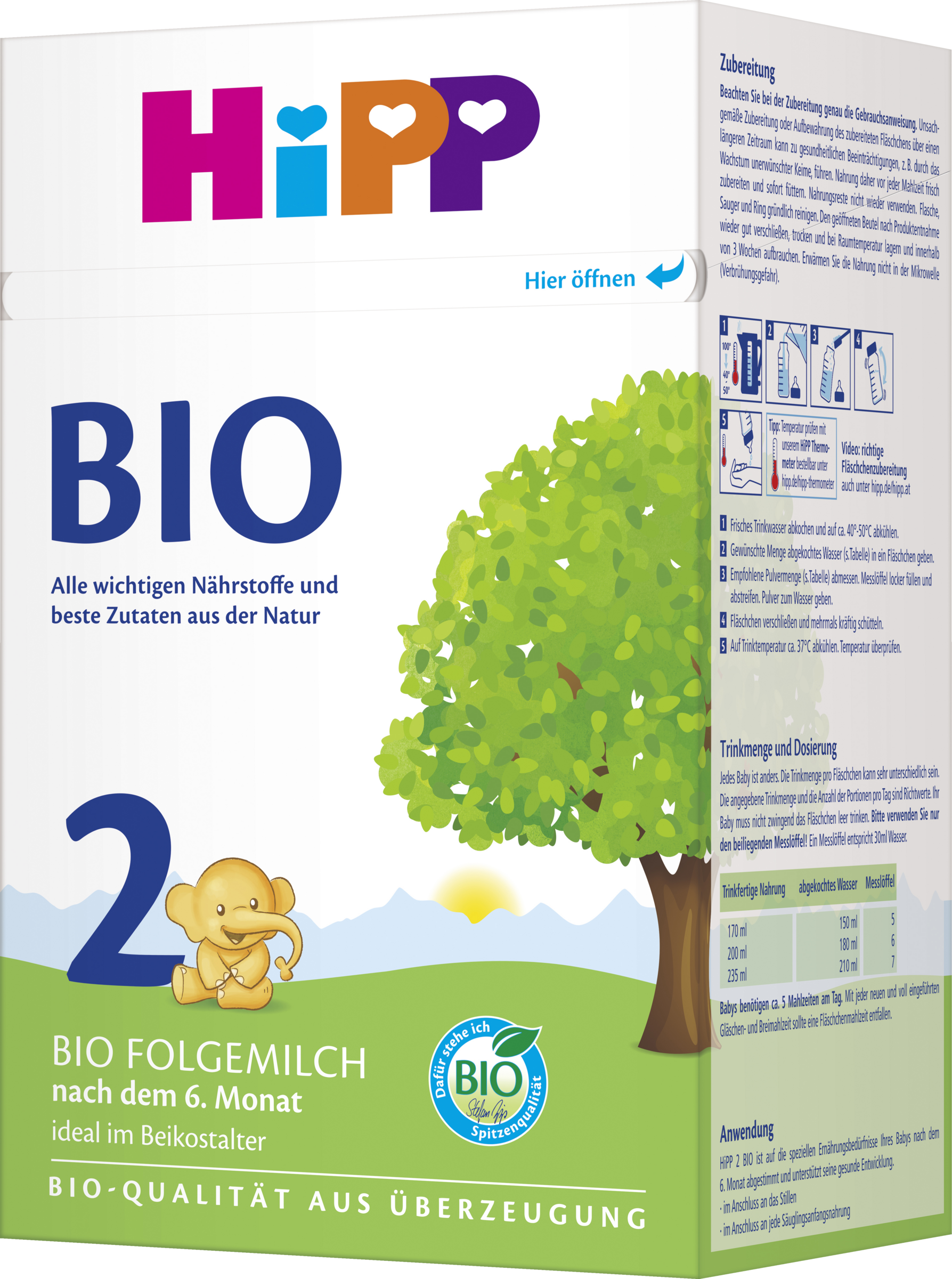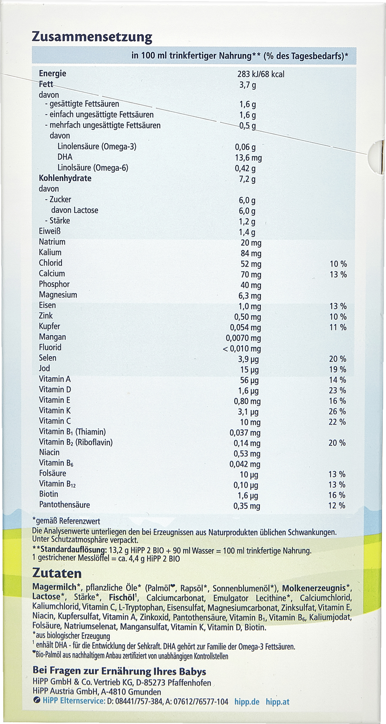 | 13,2 g HiPP 2 BIO + 90 ml Wasser = 100 ml trinkfertige Nahrung. | ||